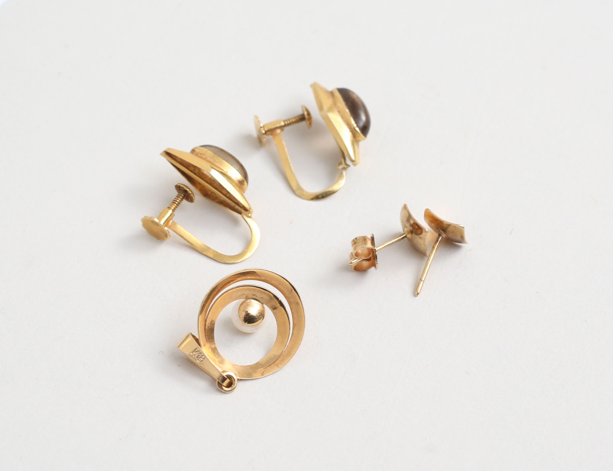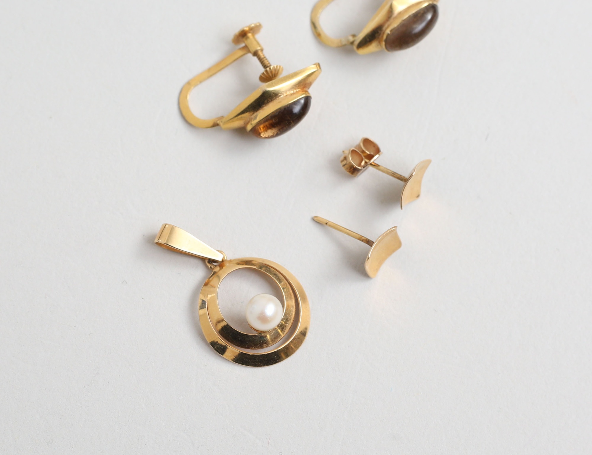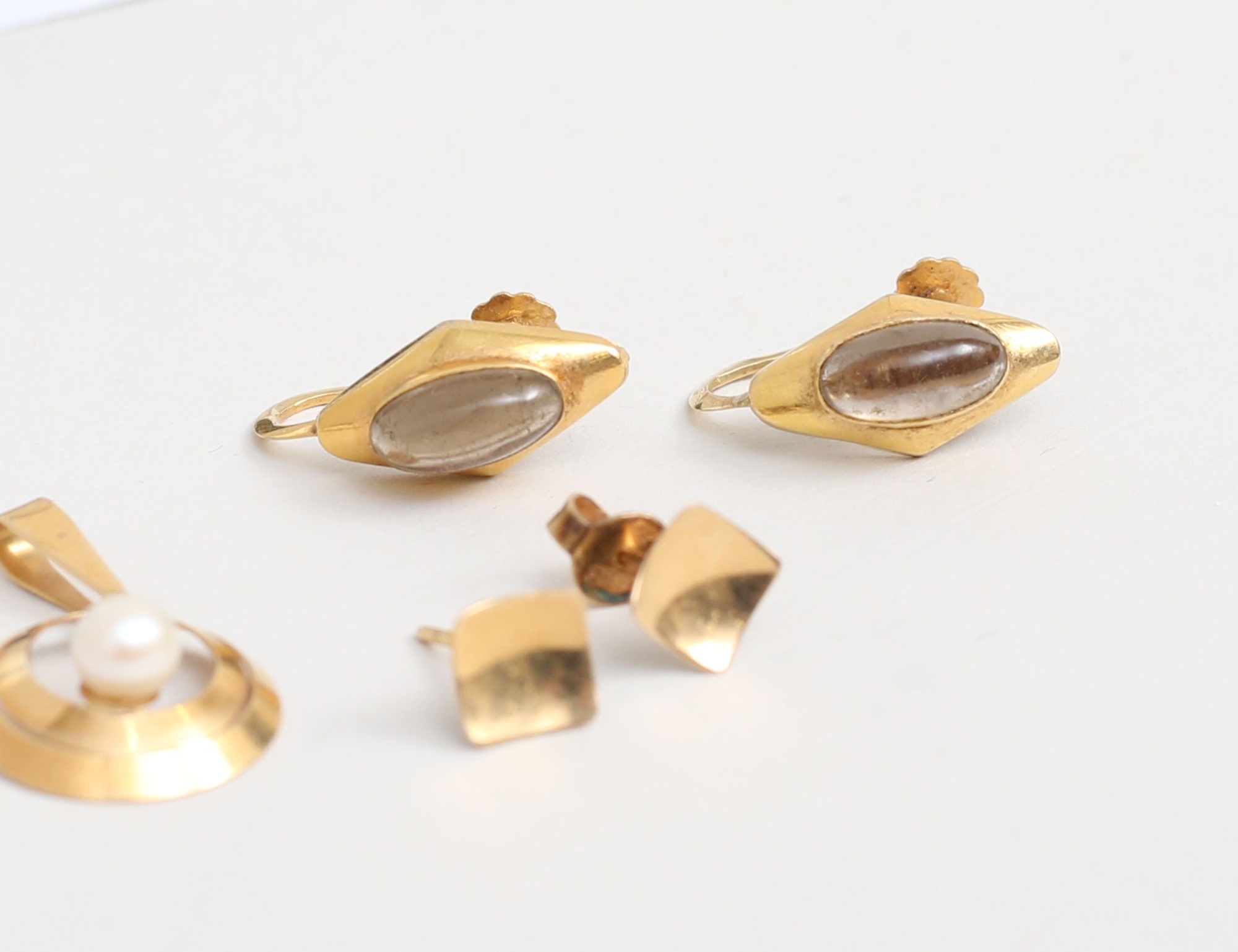 ett par med cabuchonslipade ametister (skruvar) samt 1 par kvadratiska (en plopp saknas) hänge med pärla, vikt 4,55 gram