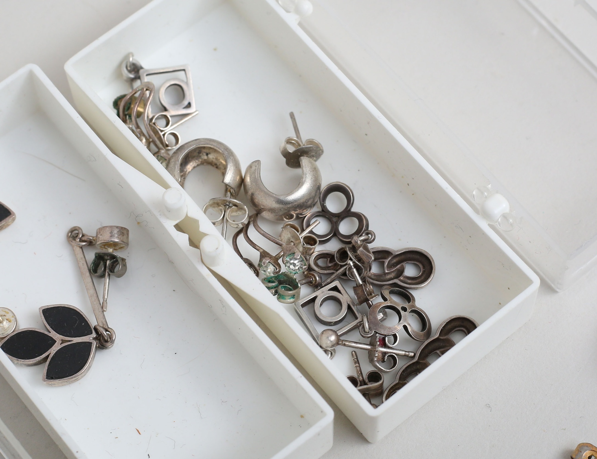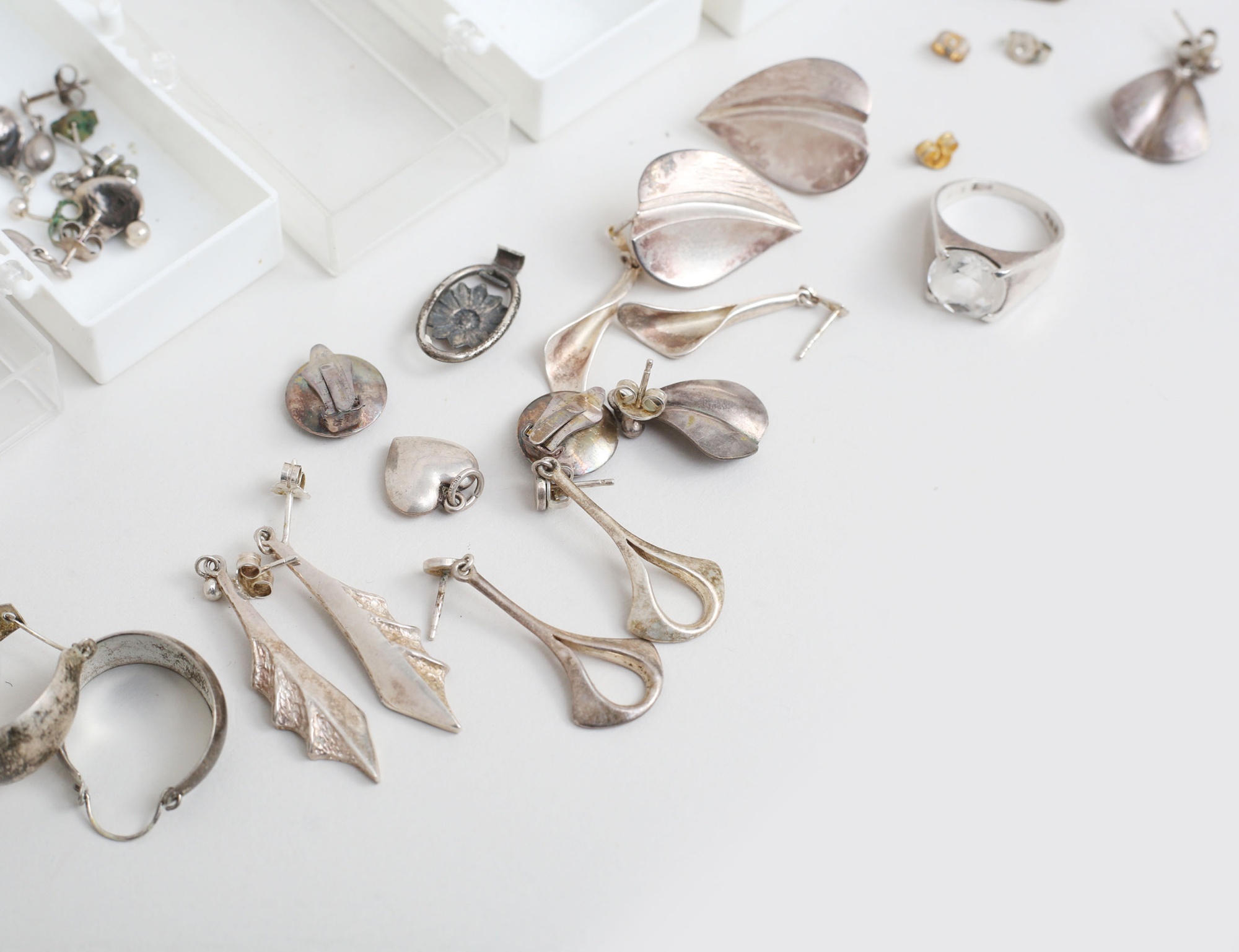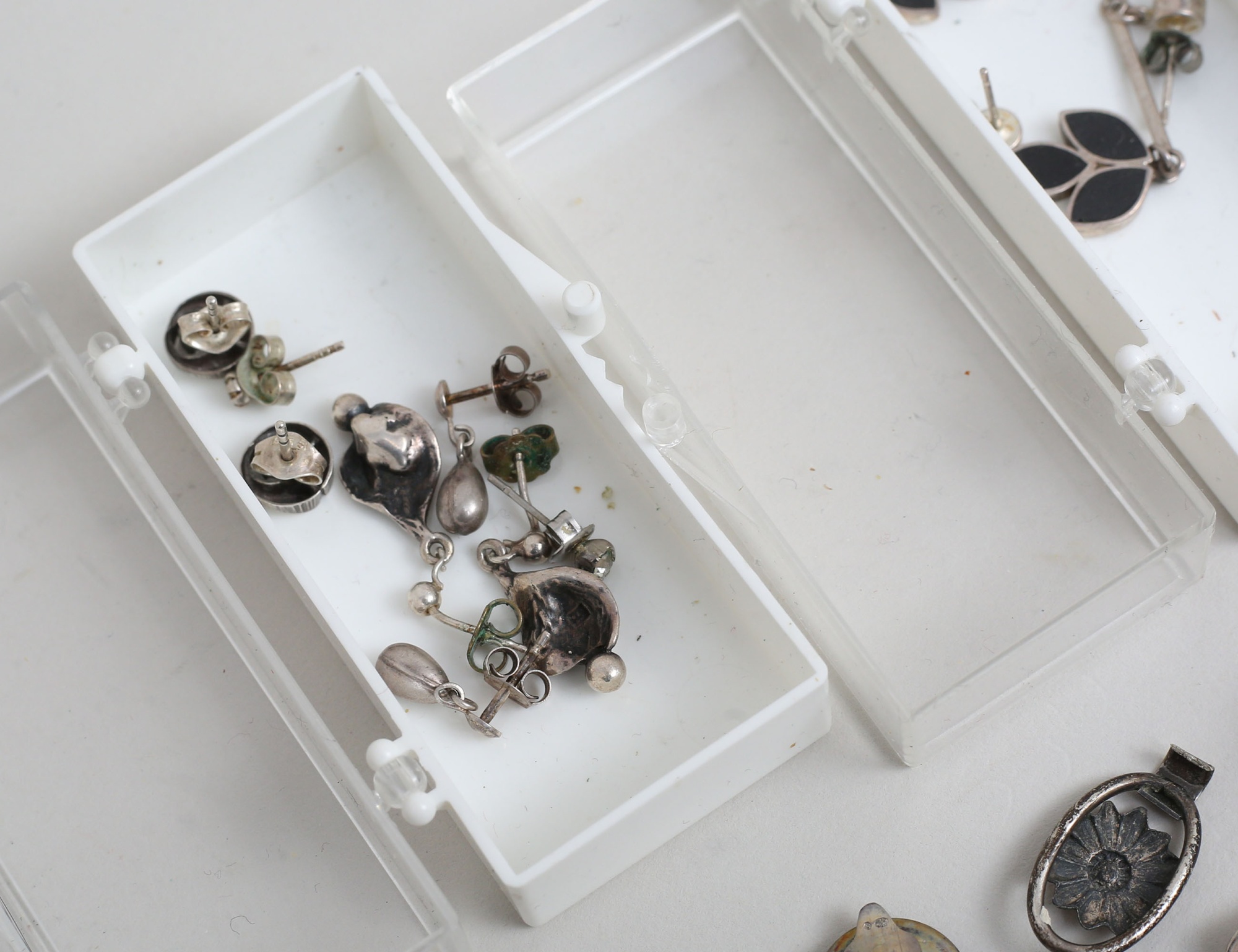 Ett par örhängen i form av löv, Matti J Hyvarinen Finland stämplade MJH 925, samt en mängd ringar, örhängen, hängen mm, vikt 56,3 gram