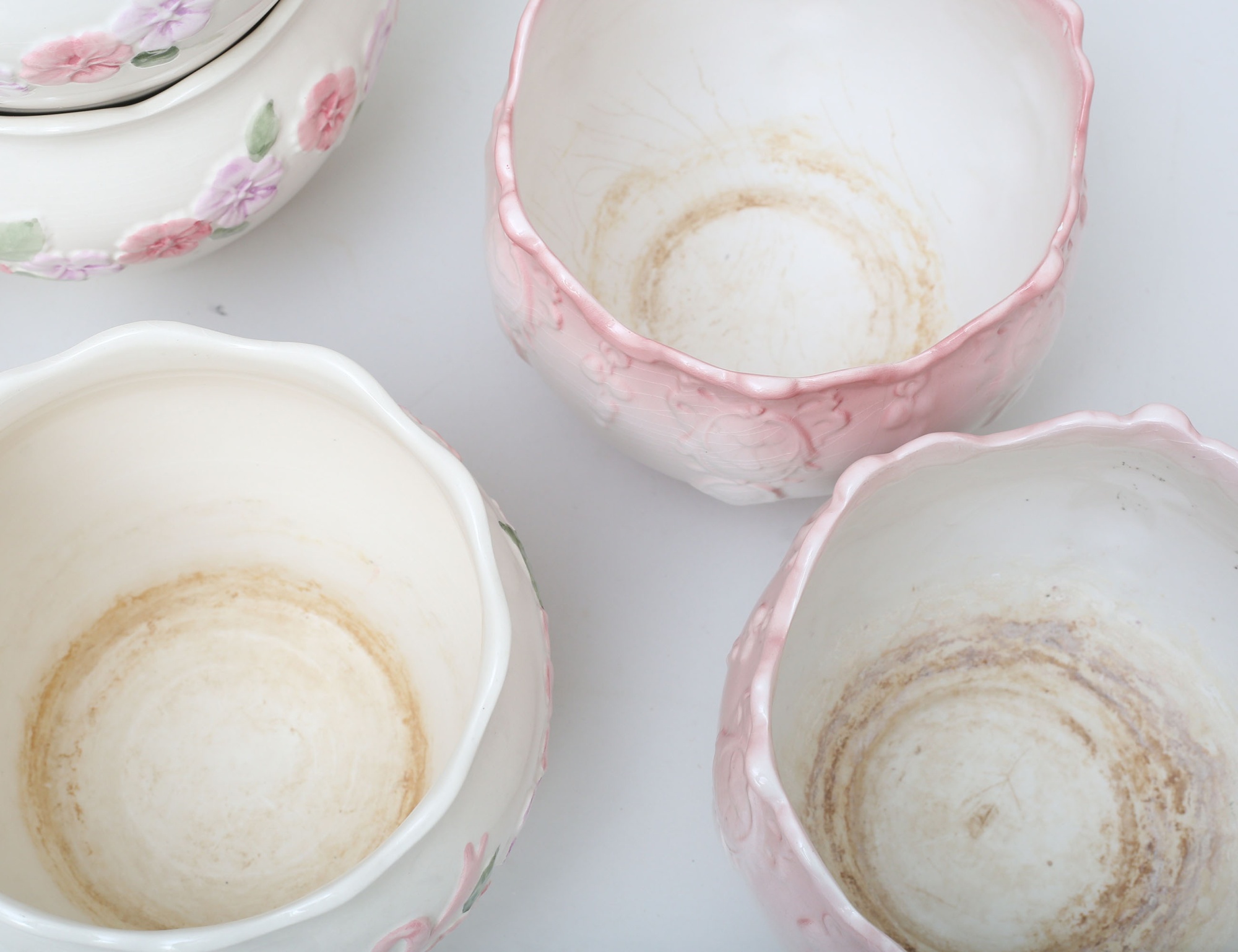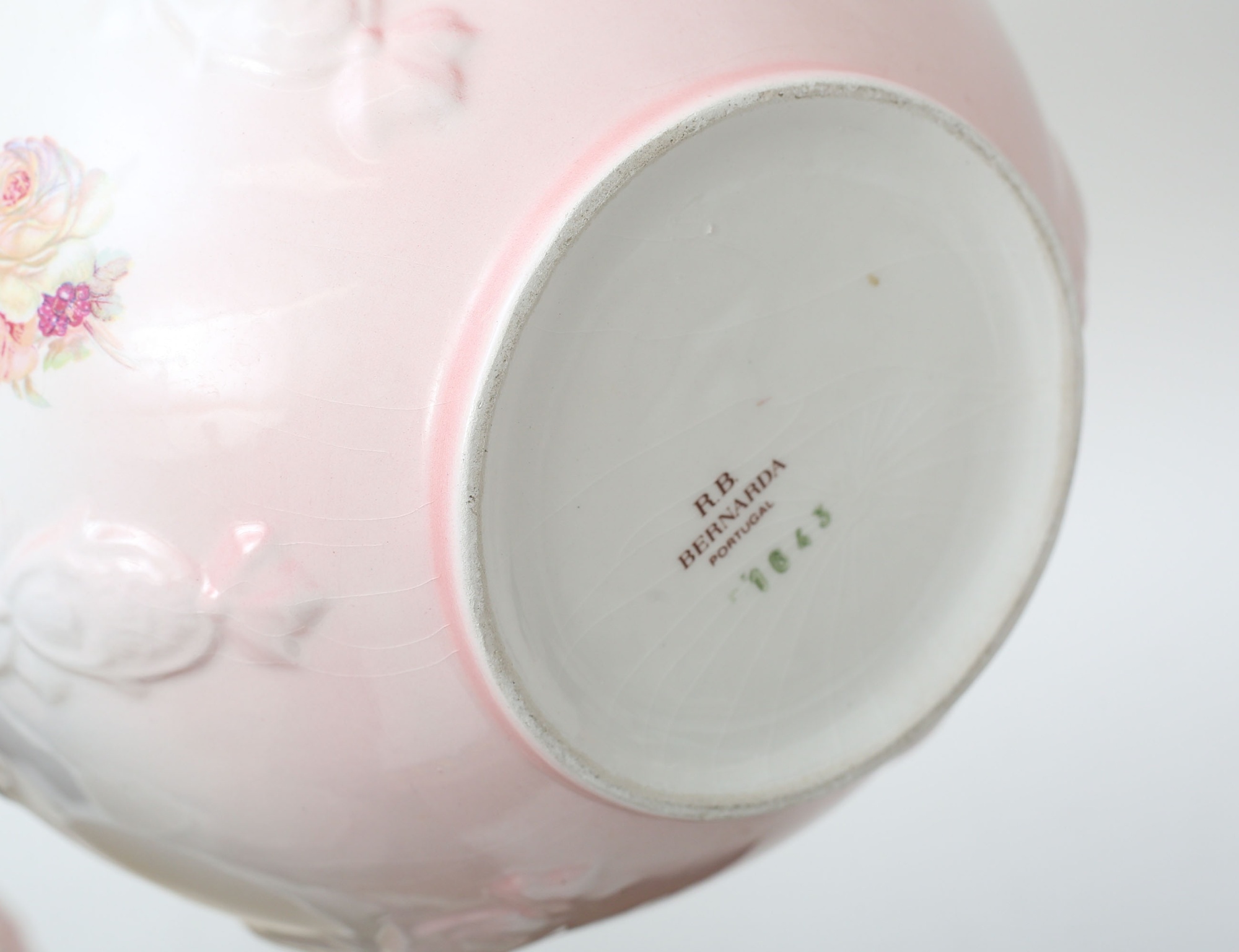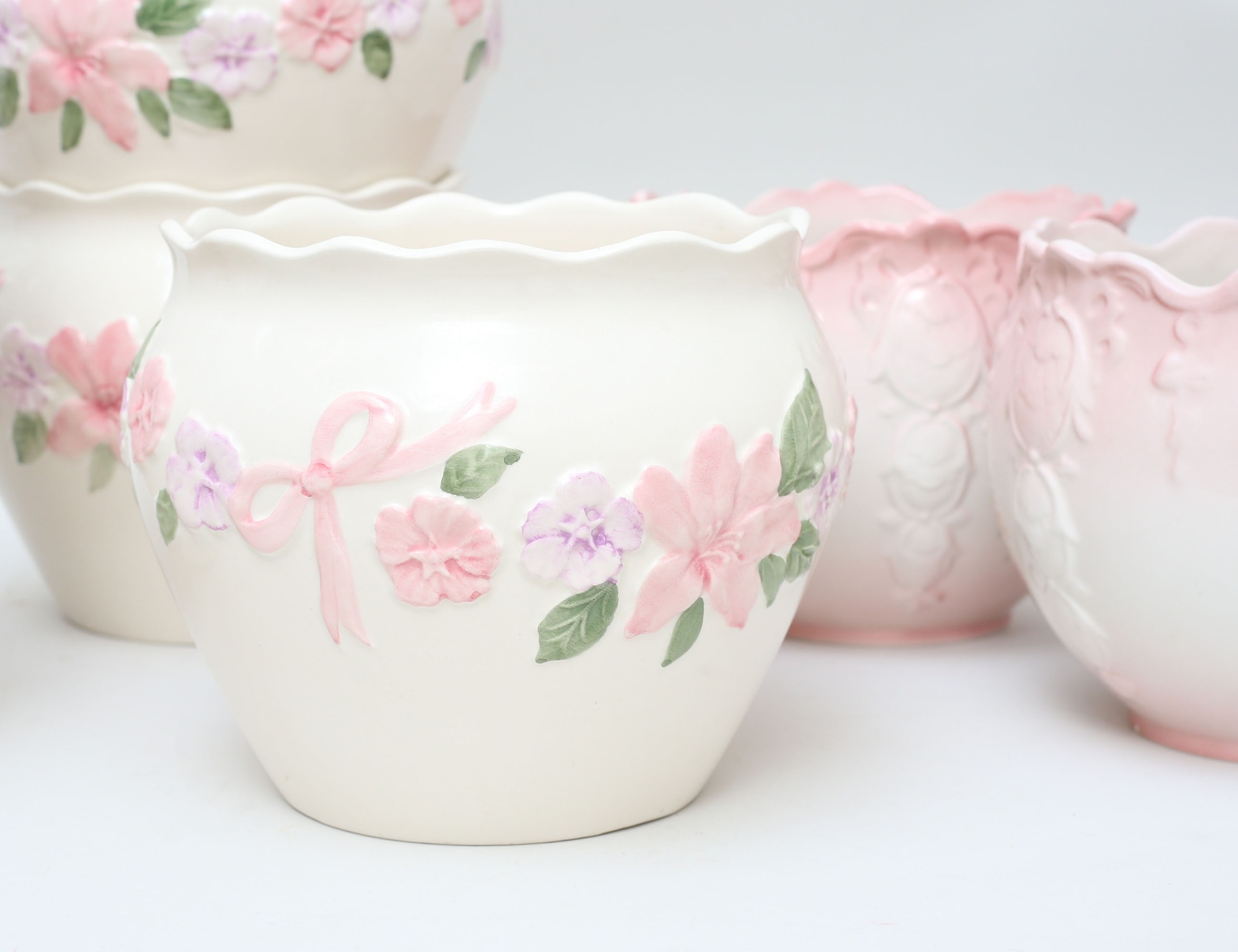 rosa och vita med reliefdekor, varav 2 märkta Bernarda Portugal, höjd 16/17, diameter 18/19 (invändig beläggning)