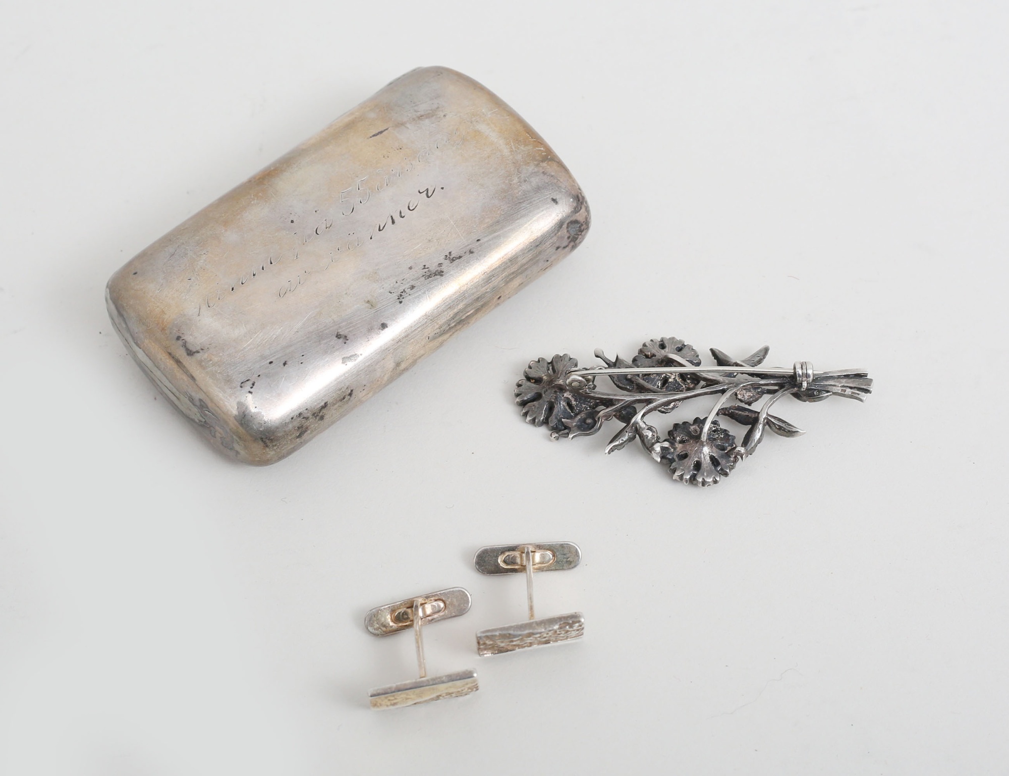 1 par manschettknappar, snusdosa (defekt) vikt 77 gram, brosch tidigt 1900-tal (vikt 13,69) i form av blomsterkvist, paste (2 stenar saknas)