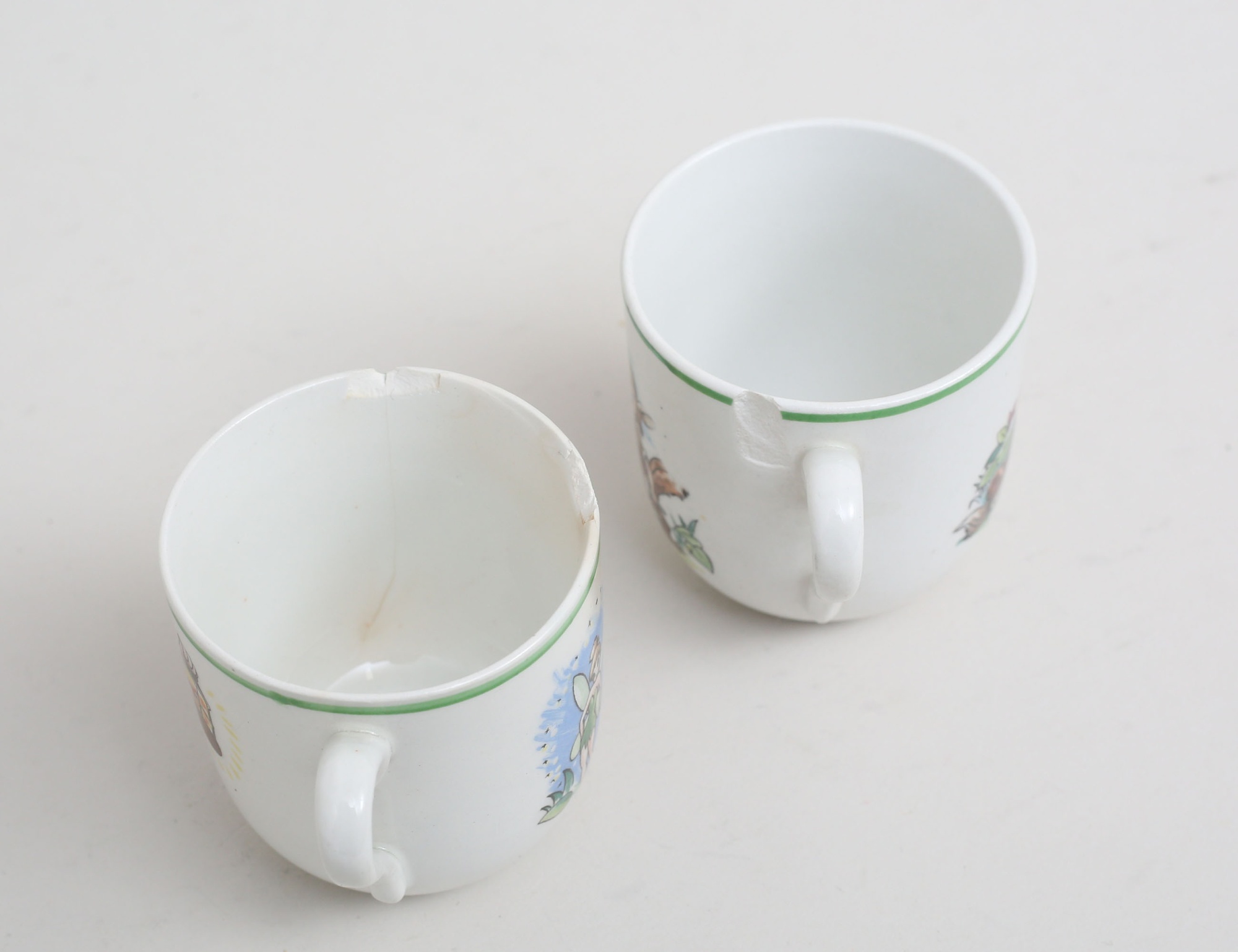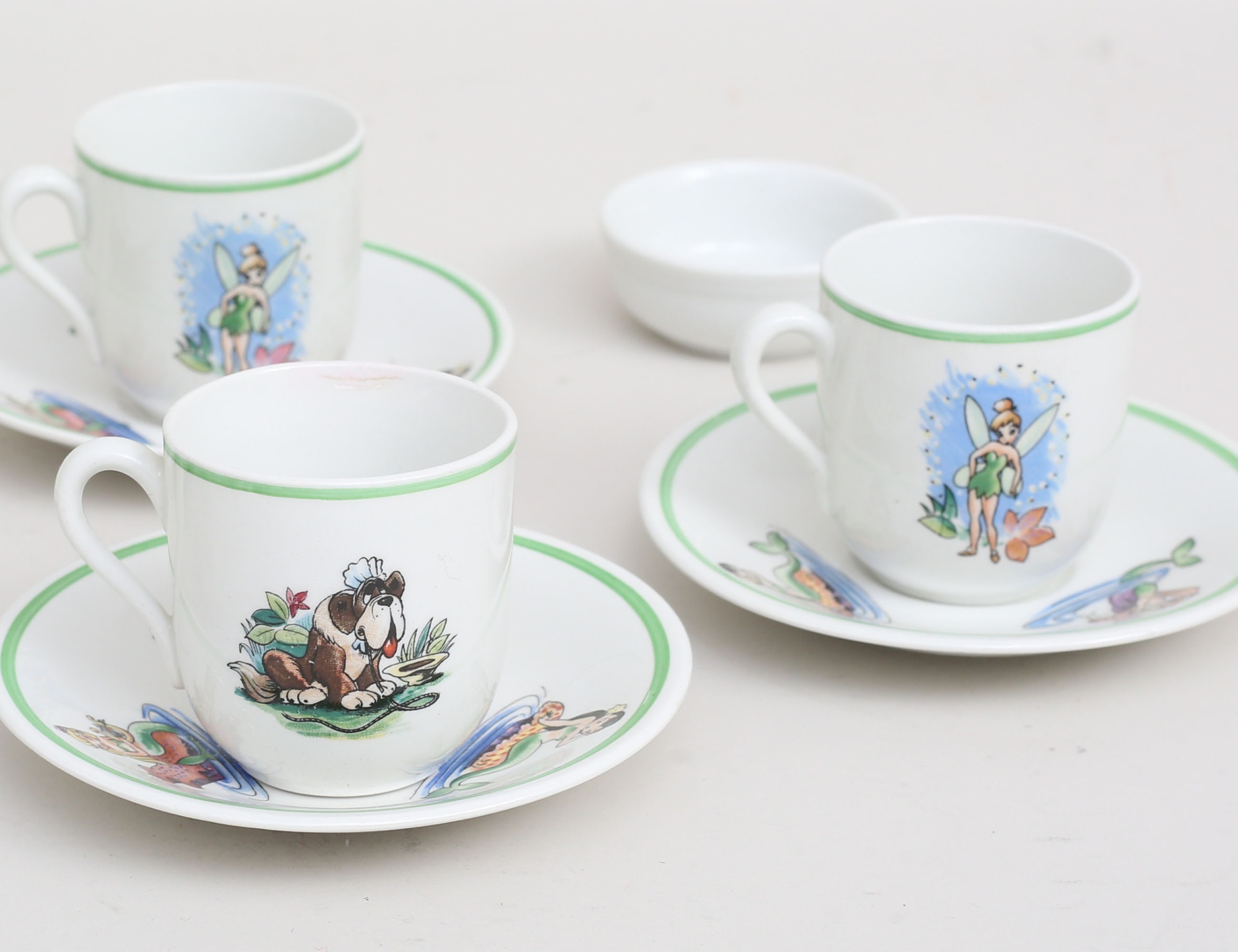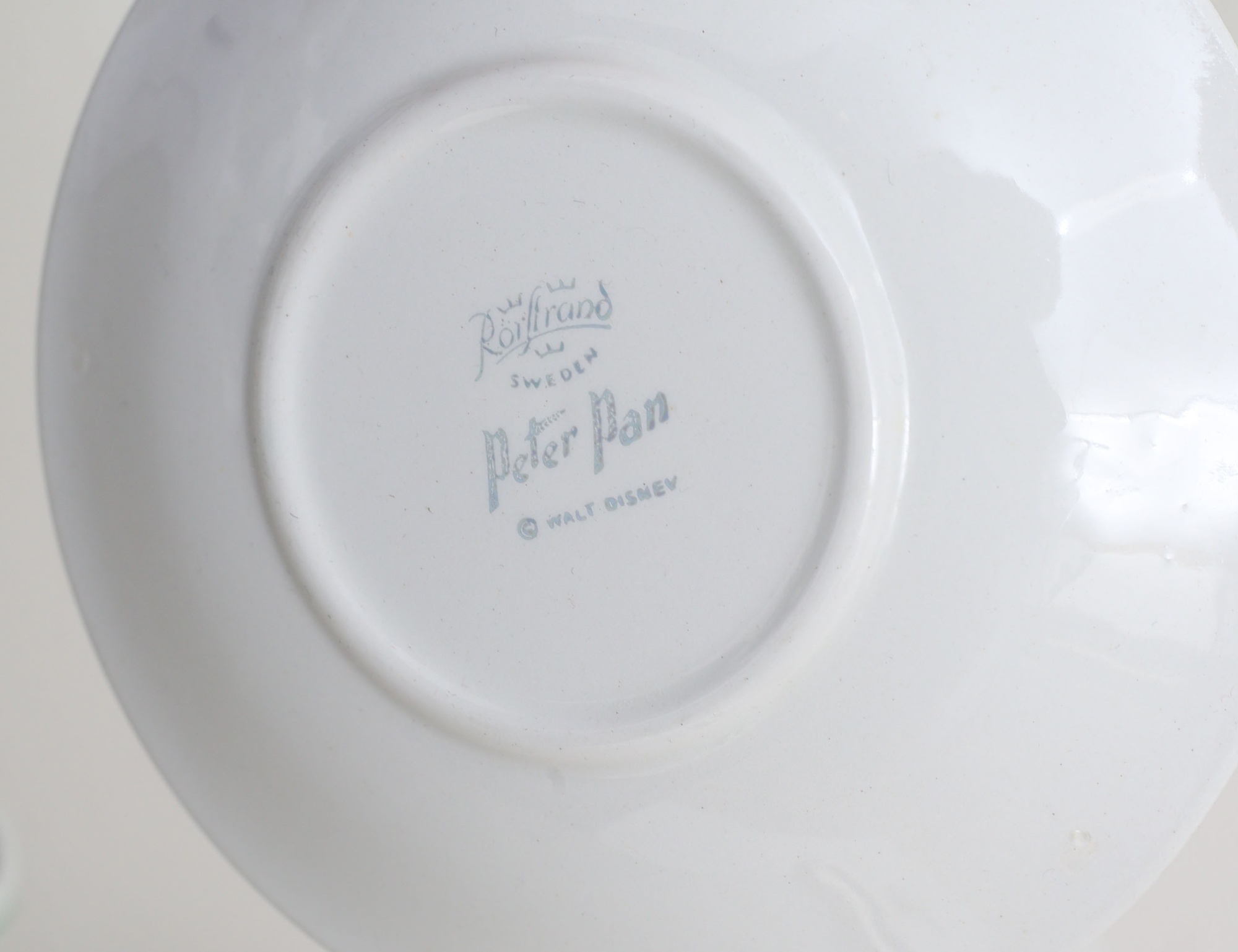 3 koppar med 4 fat samt gräddkanna "Peter Pan", (2 koppar med nagg/spricka medfljer)