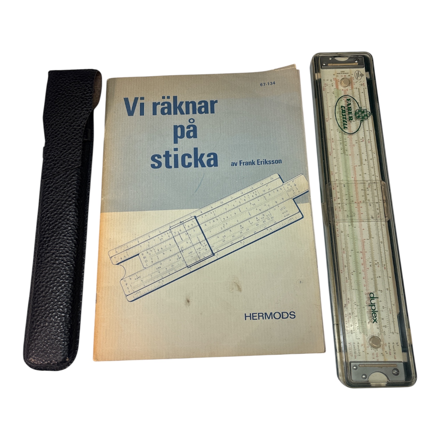 Dubbelgraduerad räknesticka i plast med transparent löpare, märkt Nestler. Levereras med originaletui samt instruktionsskrift “Vi räknar på sticka” av Frank Eriksson, utgiven av Hermods.
