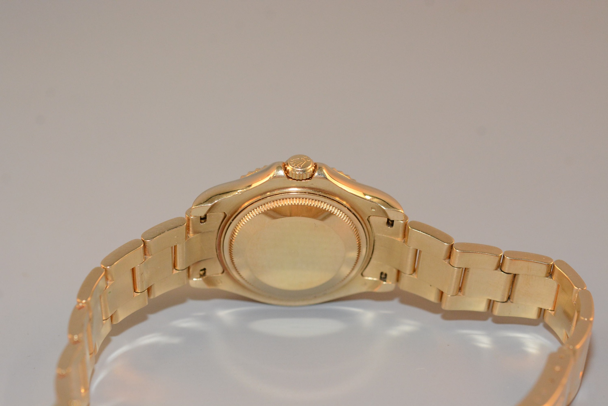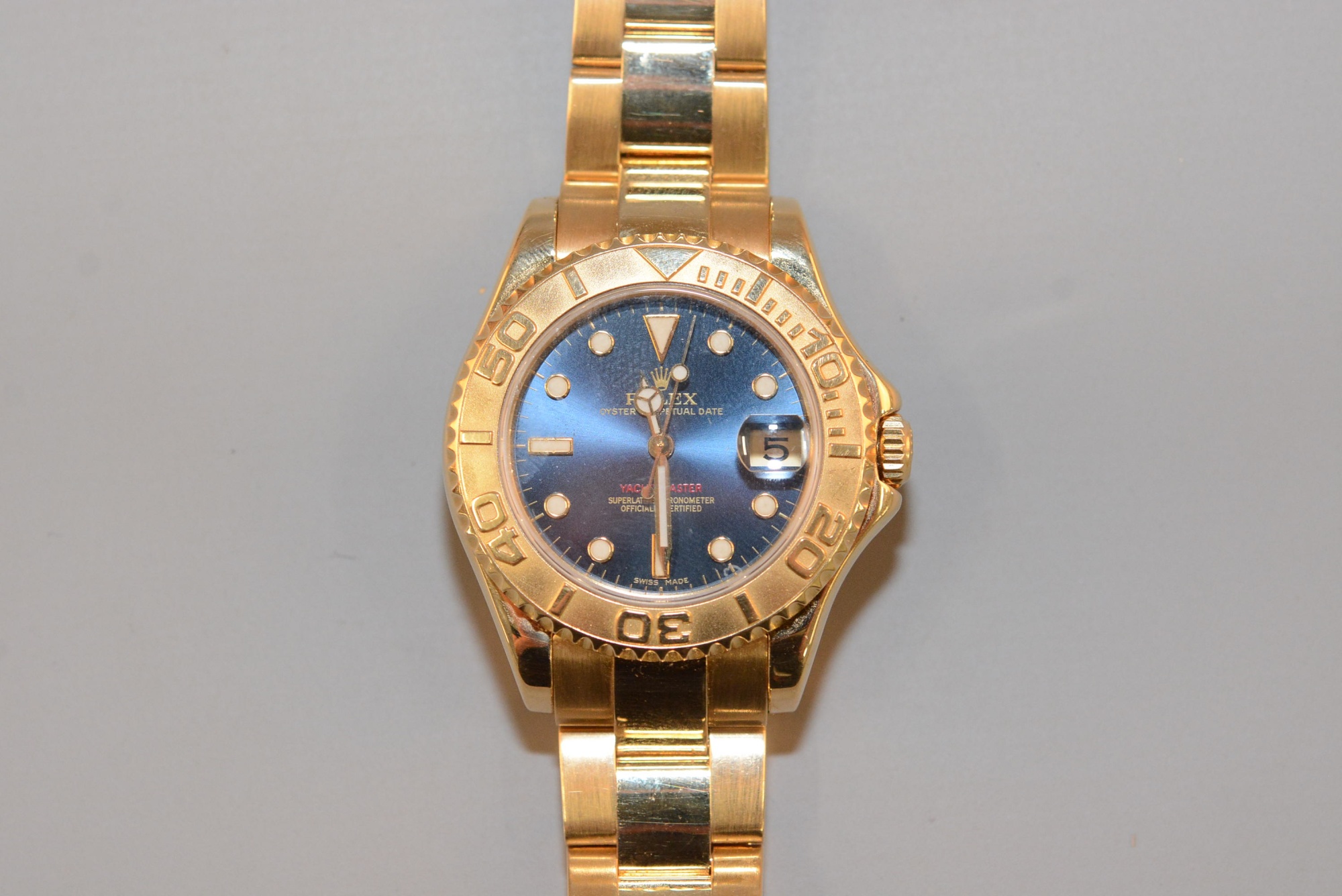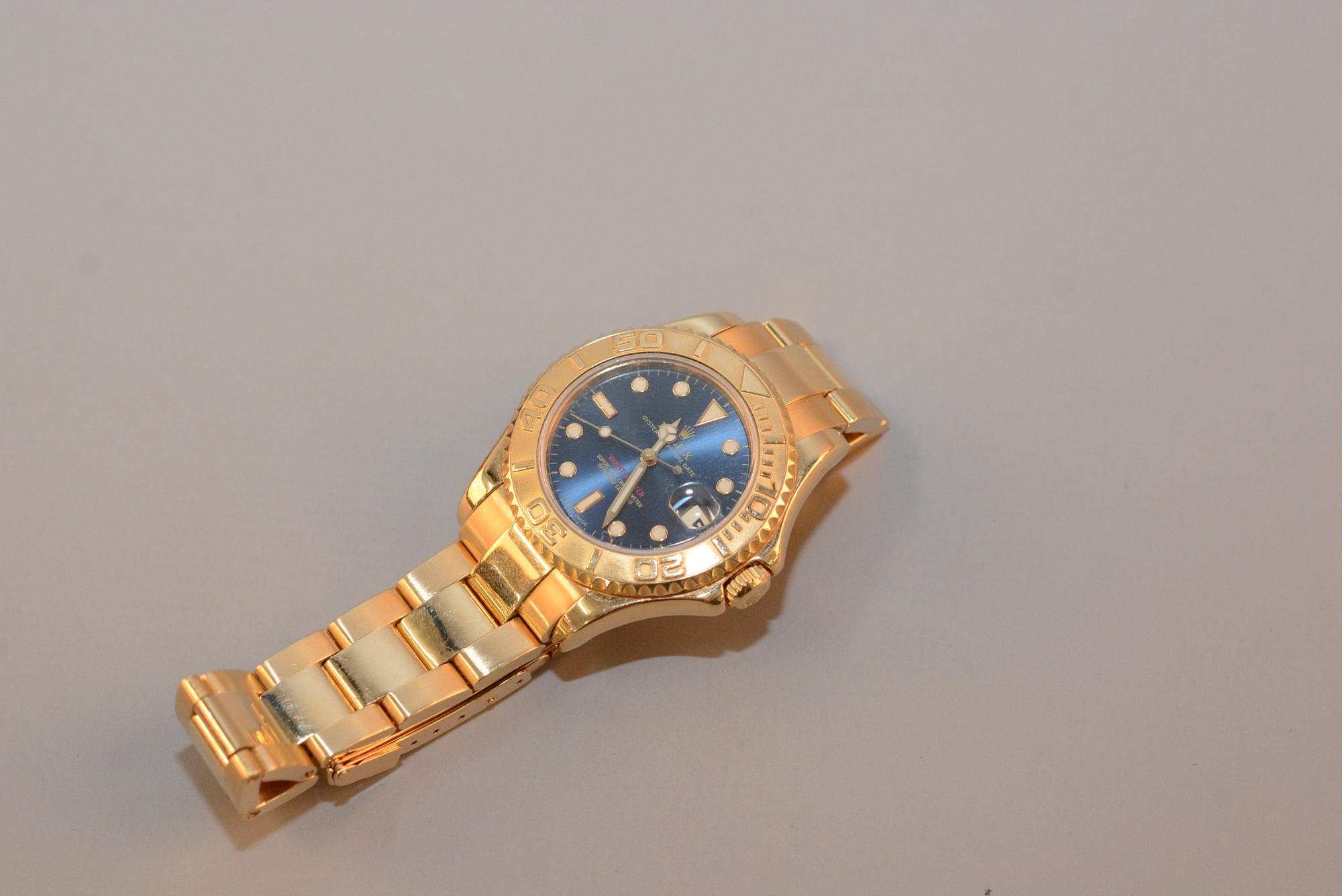 Armbandsur Rolex Yacht Master, blå urtavla, guld 18k i klocka/armband diam: 35 mm, armband L: 19 cm, inkl originalkartong, intyg
