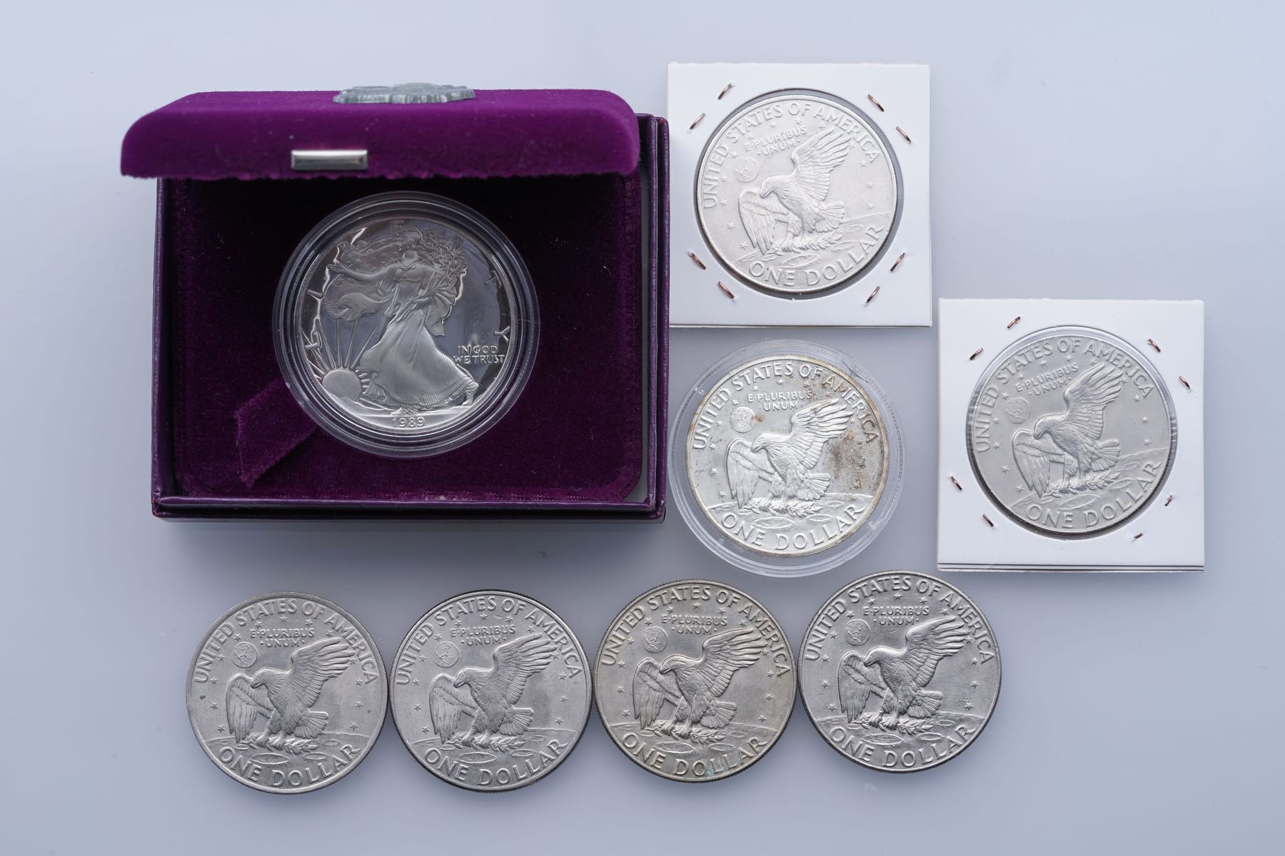 7 kpl Eisenhower Dollar, 1971-1977 ja 1989 Eagle Dollar