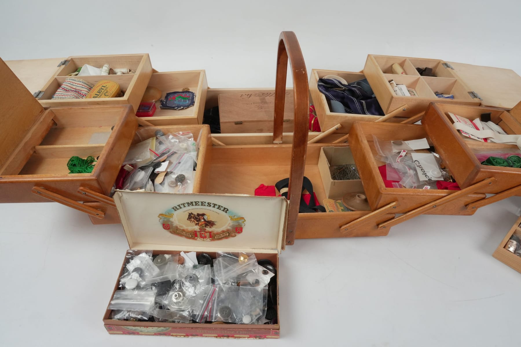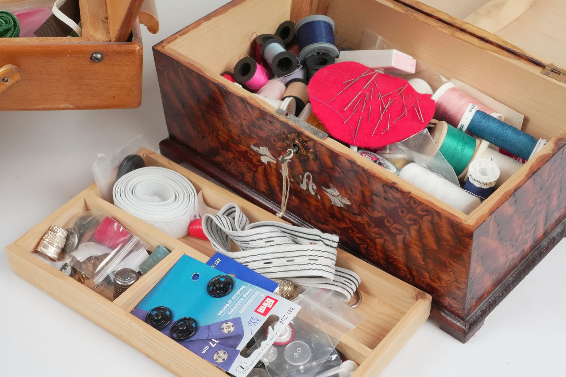SYSKRIN, 3 st, med SYTILLBEHÖR, bl.a. knappar, tråd, nålar