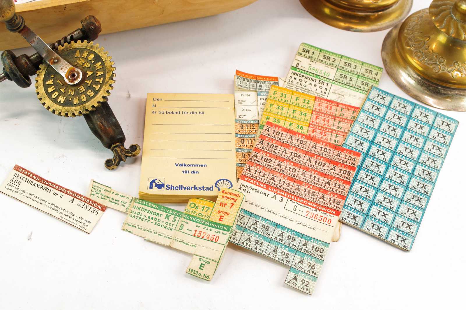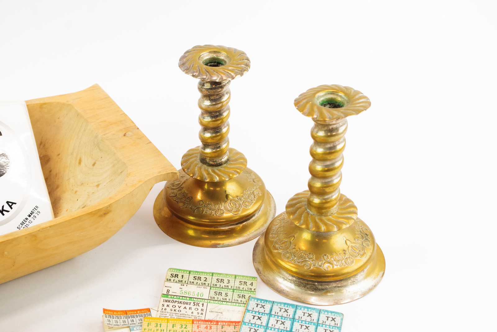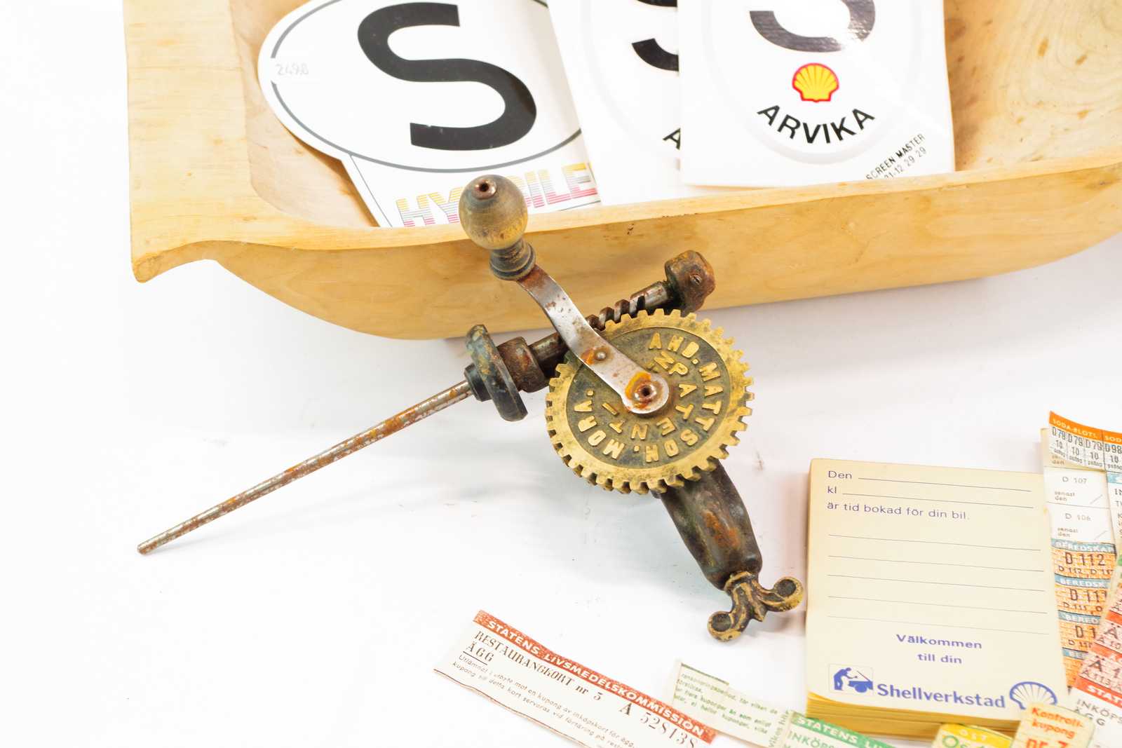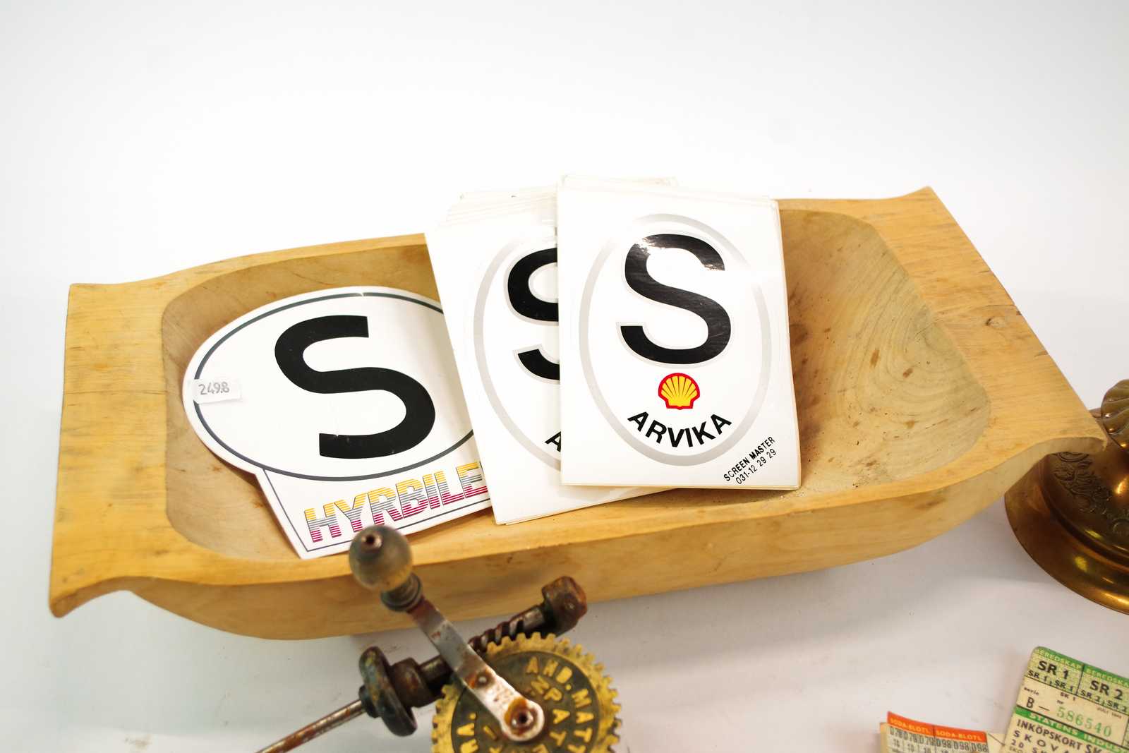 Bilder DIVERSE tråg L:39 cm, ljusstakar, spolmaskin, klistermärken Shell Arvika, mm