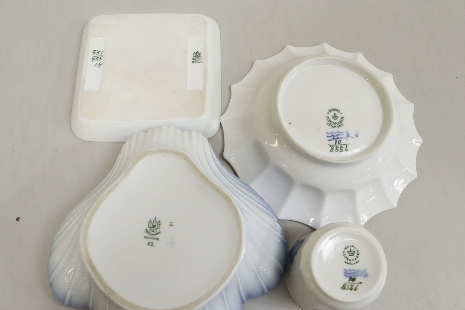 Bilder Skålar och fat, bla "Blå Blomster" och "Måsen", Royal Copenhagen och B&G