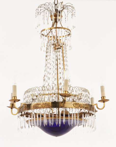 Stomme i mässing. Behängd med slipade prismor. Sex ljusarmar. Avslutande skål i blåtonat glas.