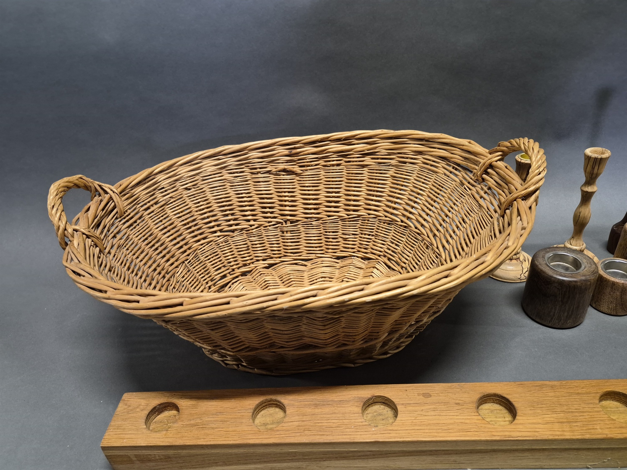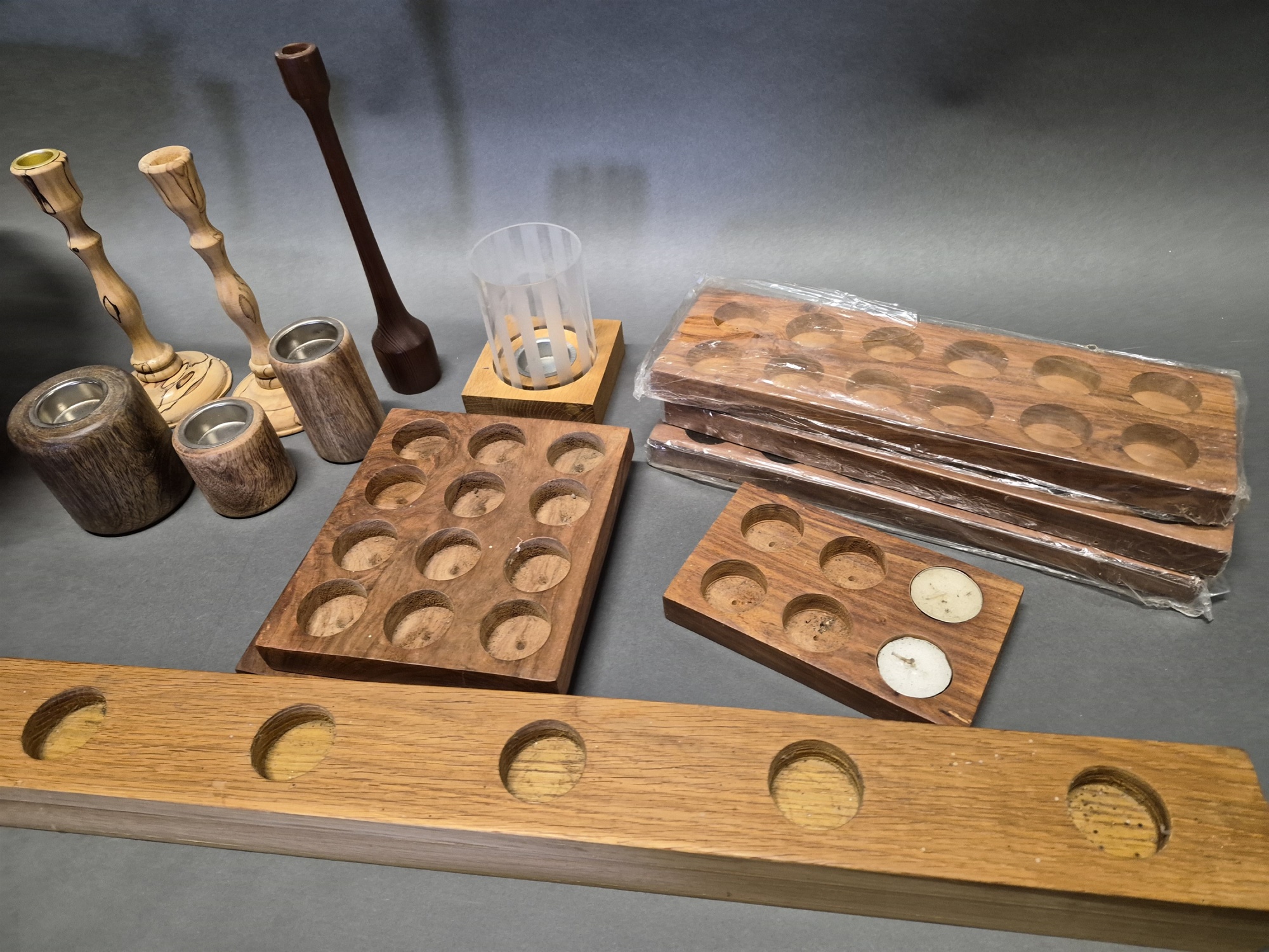 Parti ljushållare & ljusstakar i trä och mangelkorg, längsta mått 126 cm
