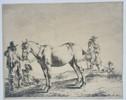 "Man Holding a Horse by the Bridle" depicts a rural scene featuring a man in a wide-brimmed hat standing beside a horse and a dog. In the background, another figure is shown mounted on a horse, while a third person rests on the ground, all set against an open, minimalist landscape. This etching is part of a series of twelve prints titled Various Horses, which was published in Utrecht in 1651. The work exemplifies the Dutch interest in equine subjects and the everyday activities of the cavalry and country folk during the seventeenth century.