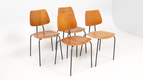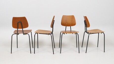 Bilder Stolar 4 st, 1950-tal, stomme i lackerat stål, sits och ryggbricka i teakfanérad plywood