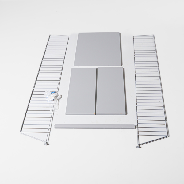 NILS & KAJSA STRINNING, STRINGHYLLA MED SKRIVBORD, 5 delar, skrivbordsskiva, 2 st hyllplan, 2 gavlar samt en skiva som håller upp skrivbordet, skruvar medföljer, grålackerat.