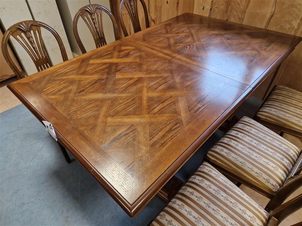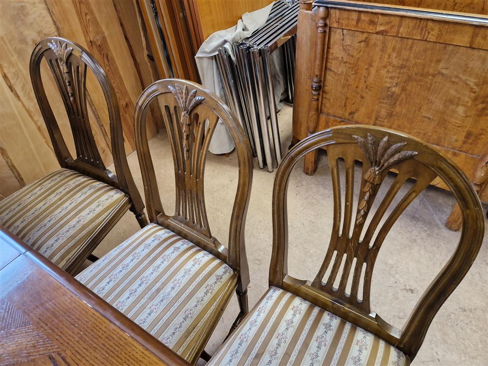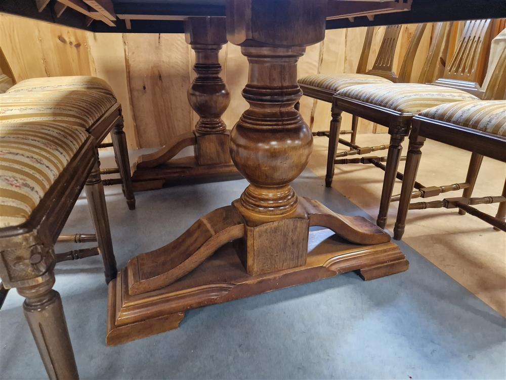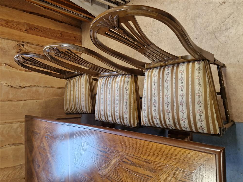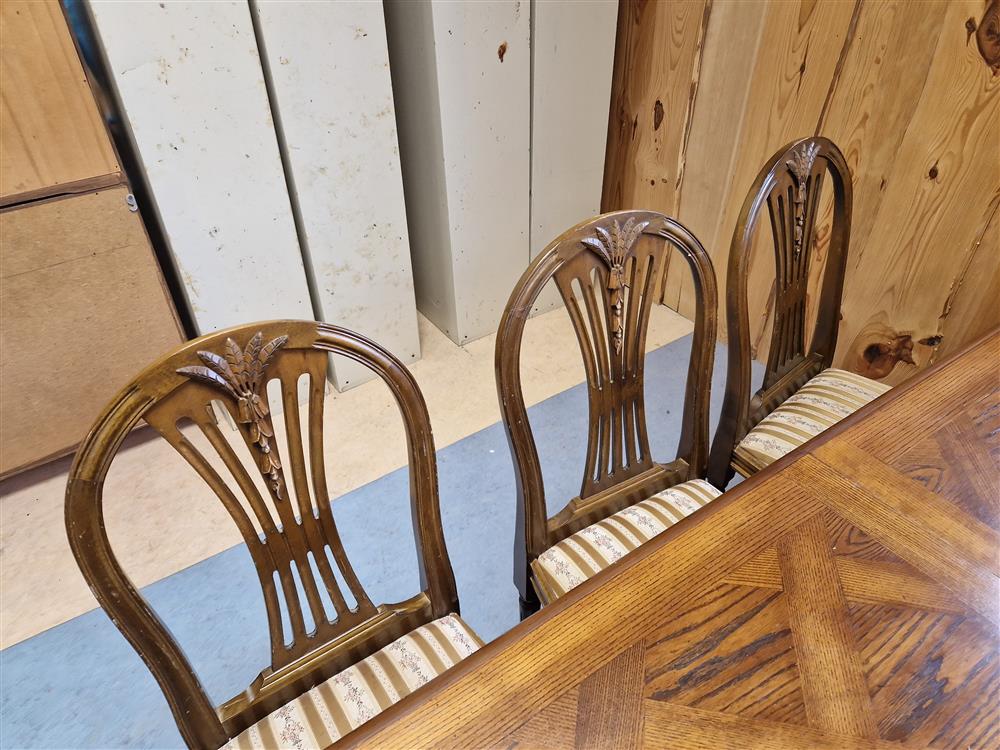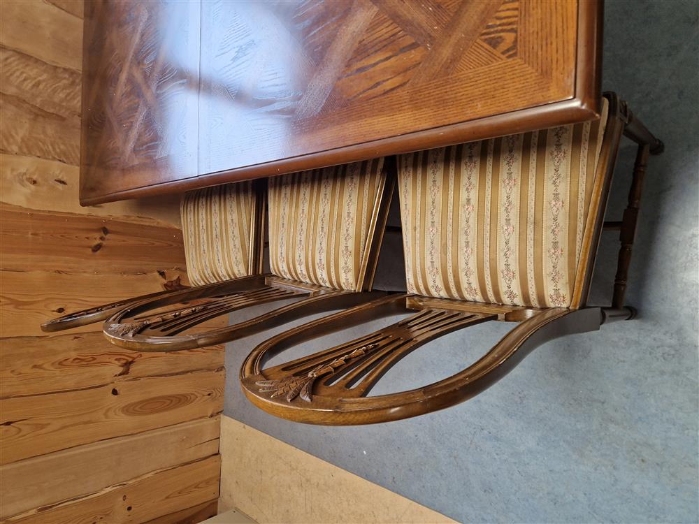 Ekbord höjd 77cm, 1 st iläggsskiva, 6 st klädda stolar