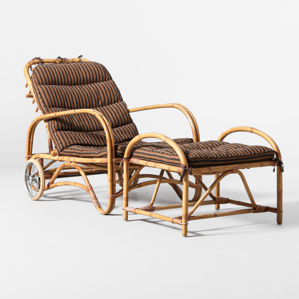 JOSEF FRANK (1885-1967), vilstol med fotpall, rotting och bambu, lösa dynor, ställbar rygg, 1900-talets mitt