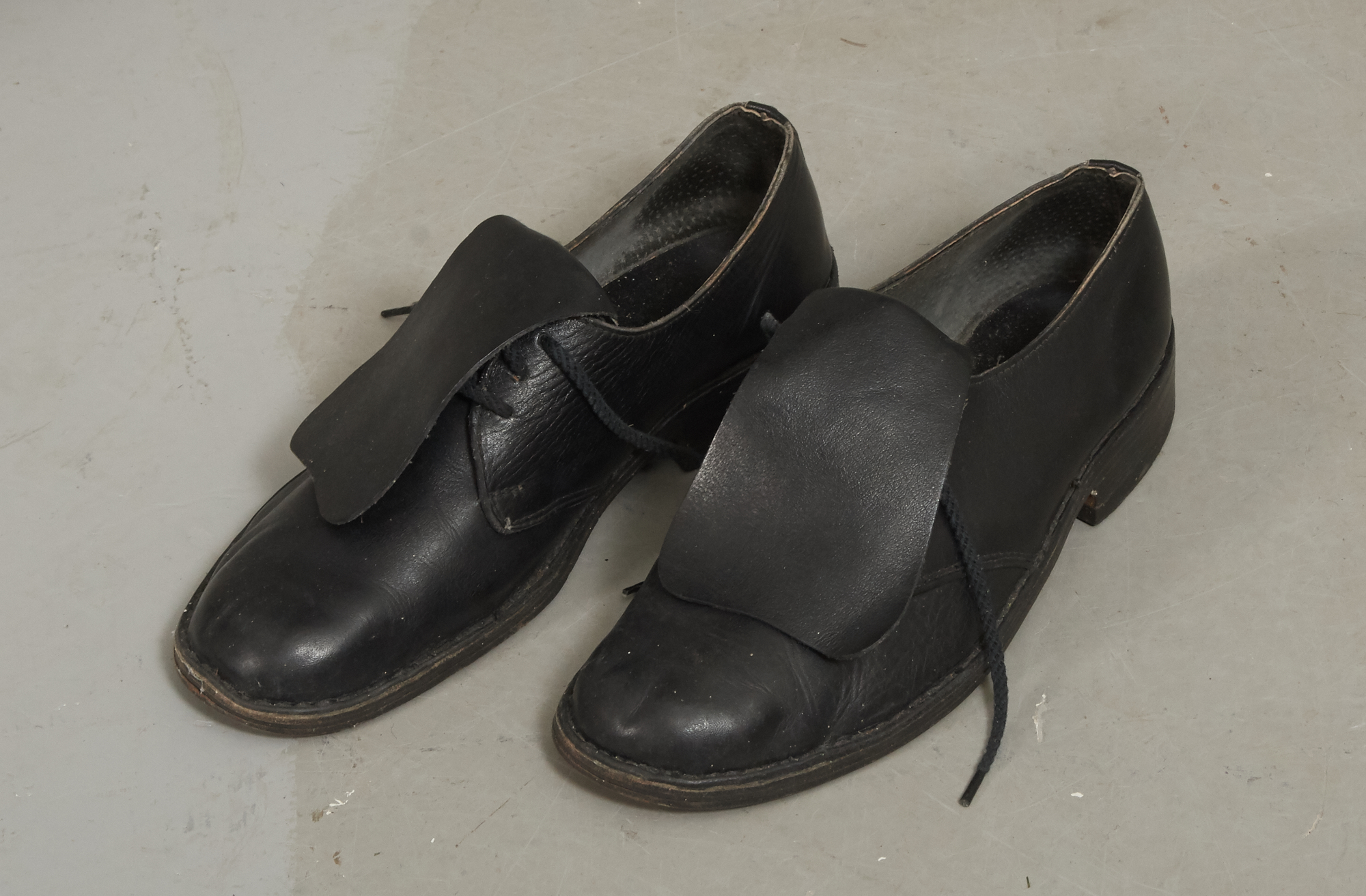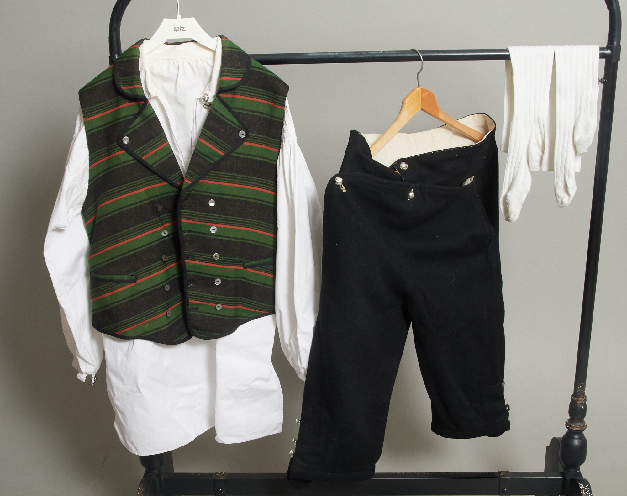 Handsydd, 5 delar. Vit skjorta ROS=Rolf Olofs Son med 3 silverknappar, Svarta byxor med 10 silverknappar, grönrandig väst, folkdansskor st 43, vita knästrumpor. Bruksslitage