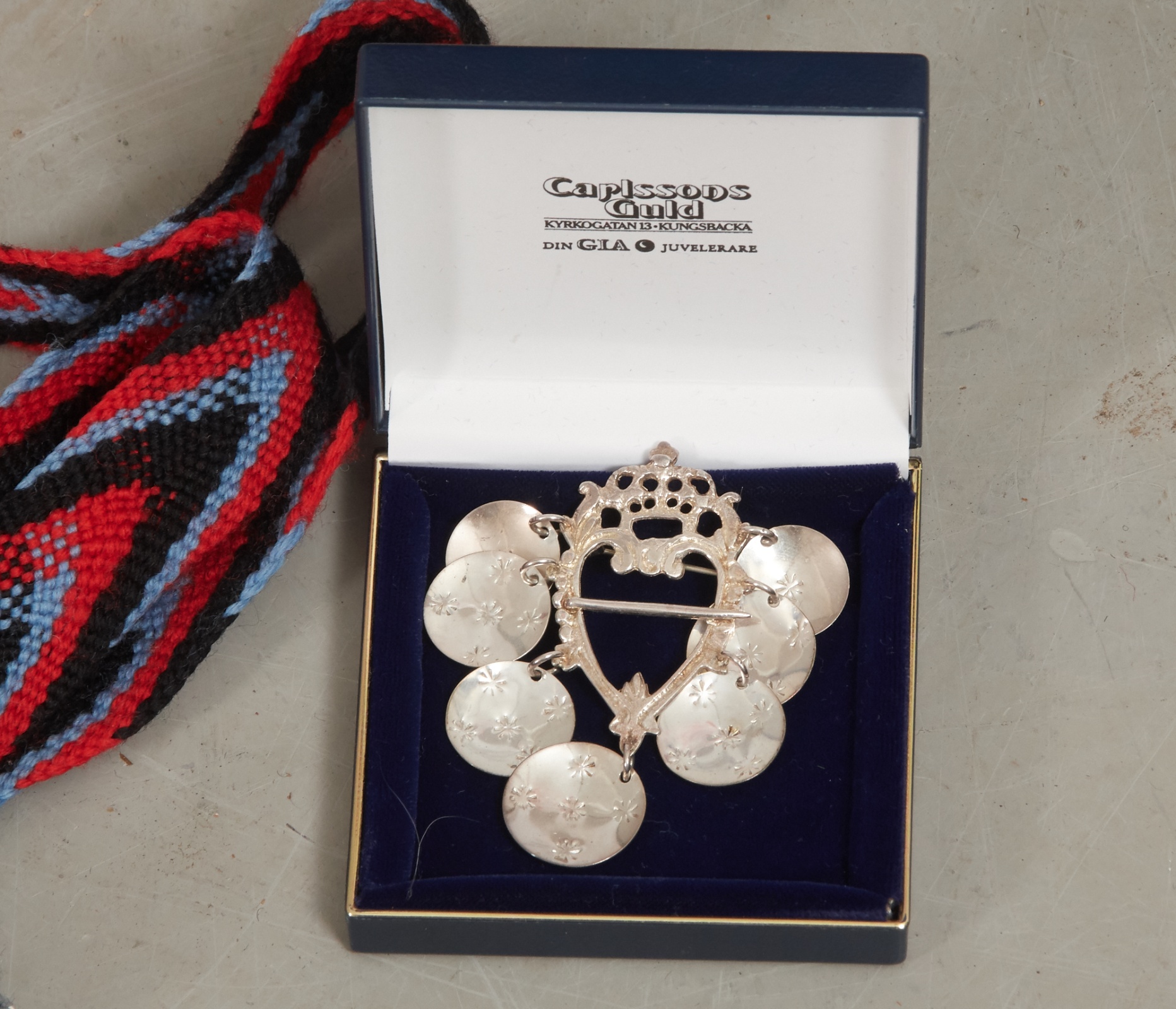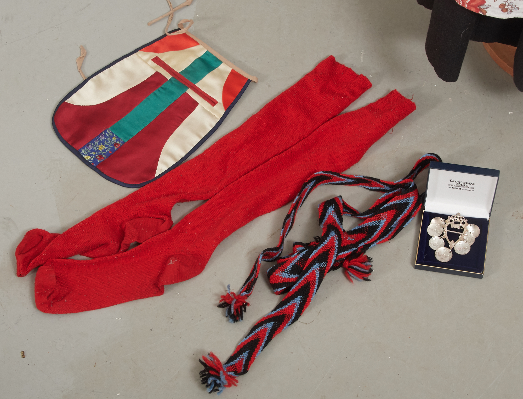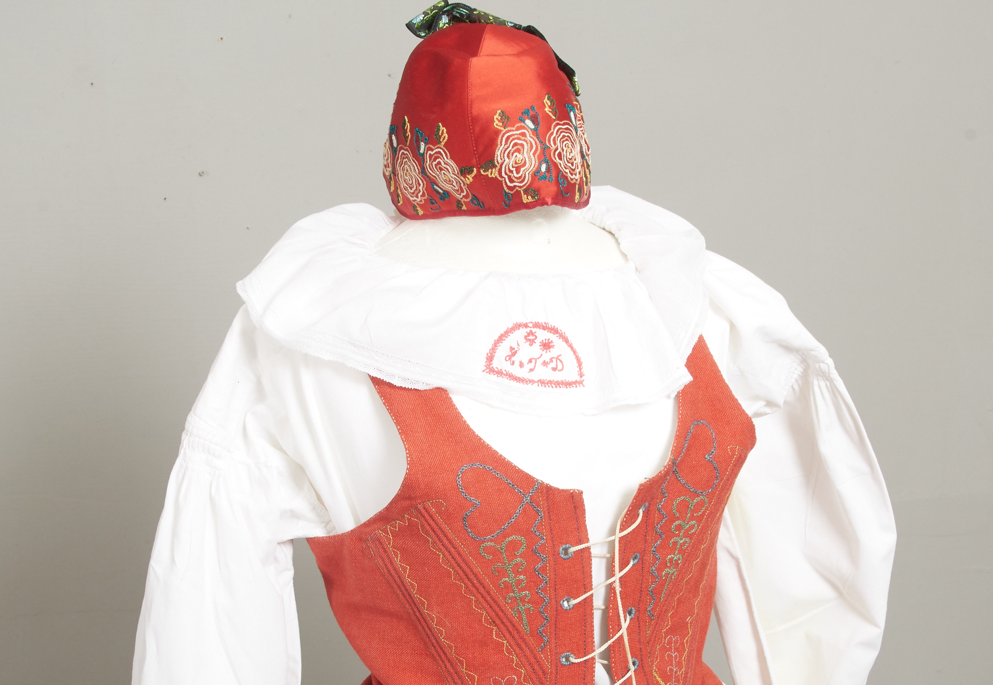 Handsydd, 8 delar. Svart kjol, rödblommigt förkläde, vit särk HTD= Harriet Tores Dotter, silversmycke, röd väst, röda strumpor med flätade strumpeband, broderad röd bindmössa med stycke, kjolficka. Bruksslitage