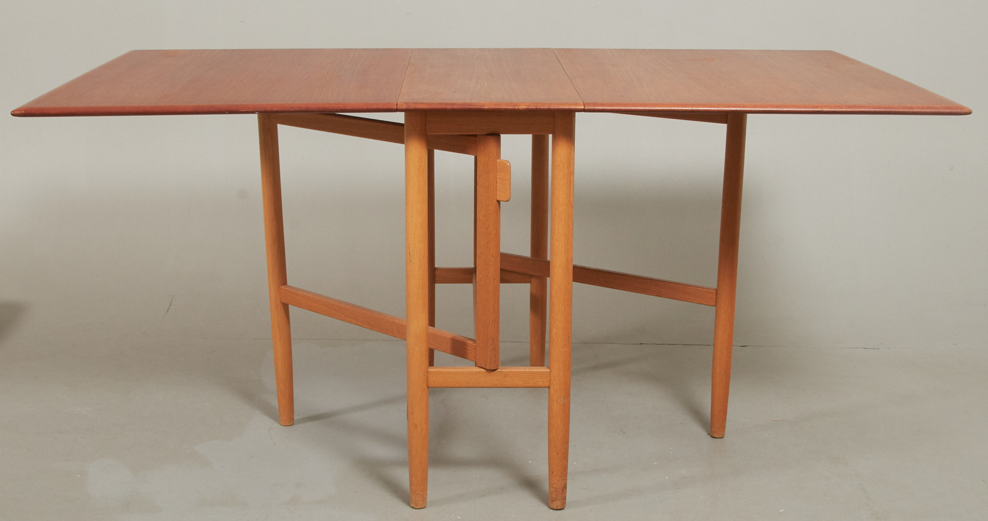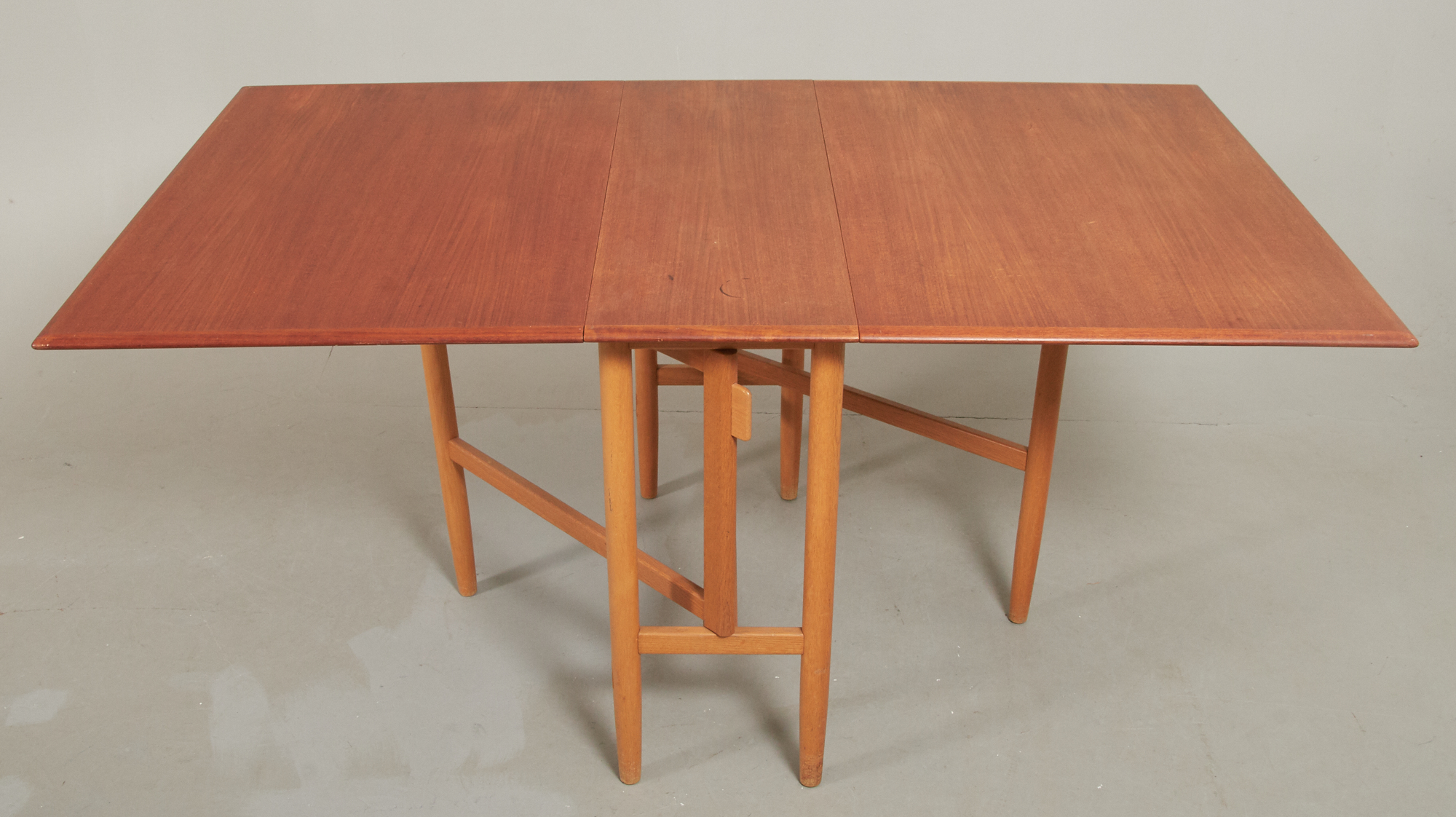 1950/60-tal, teak, samt ek, 90 x 34 cm, höjd 74 cm, 2 slag á 63 cm, smärre bruksslitage, men skiva med fläckar.