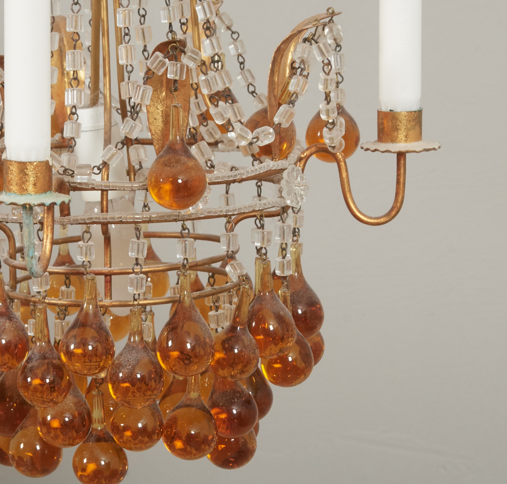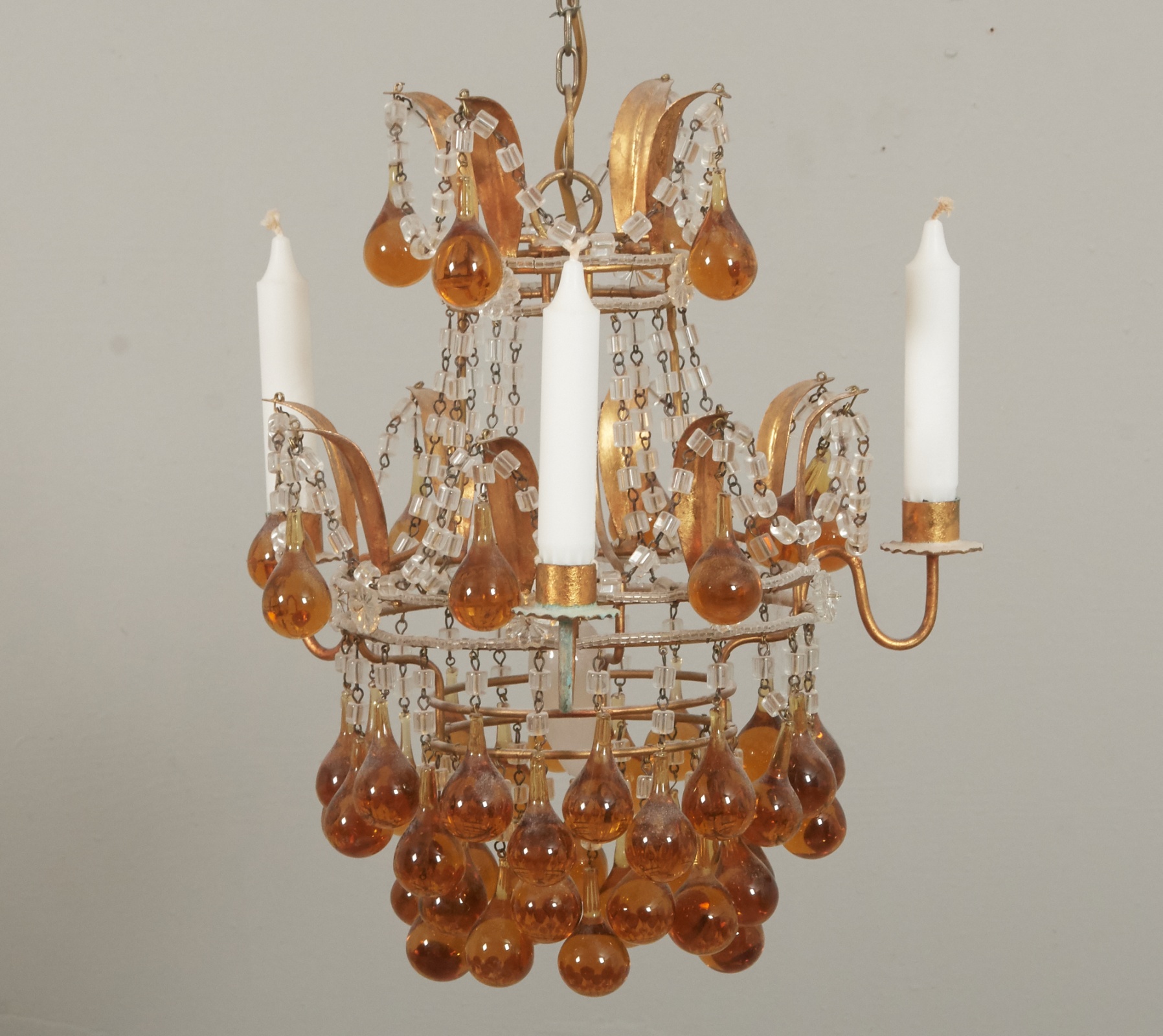 Med prismor, samt bärnstensfärgade droppformade prismor, en elektrisk ljuspunkt, samt hållare för 4 levande ljus, höjd exkl. upphängning 40 cm, smärre bruksslitage.