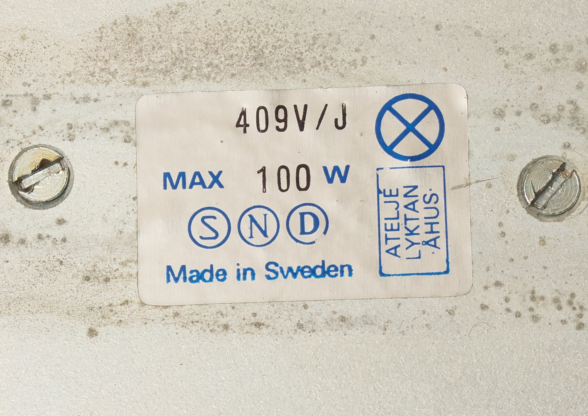 Vitlackerad metall, etikettmärkt. Ej funktionstestad, färgskav vid fästet, raster fattas.