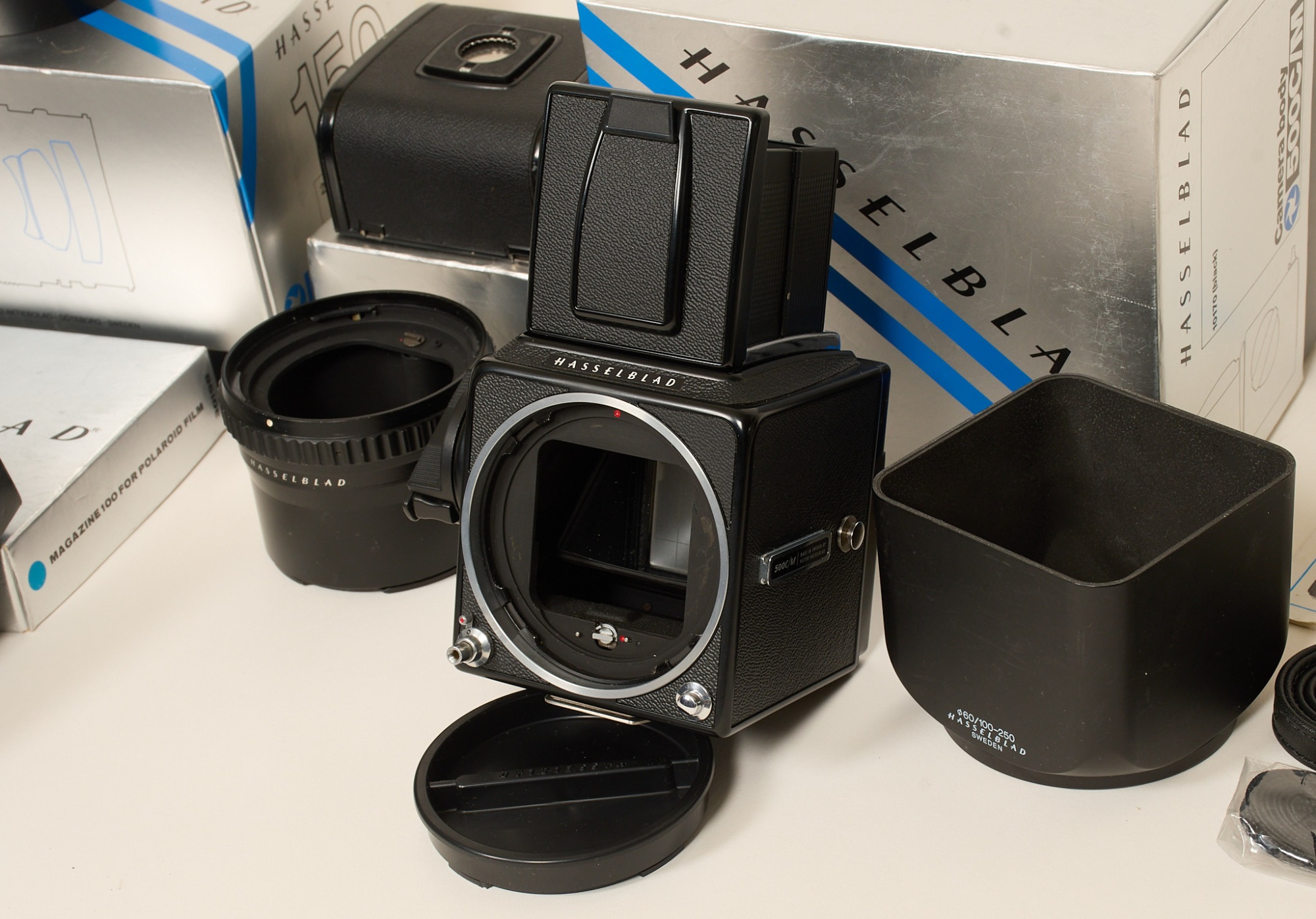 Hasselblad zeiss somnar CF 150 mm, Filmmagazine A16S, polaroid magazine, mellanring 55, motljusskydd 60/100-250 mm. Ej funktionstestat.