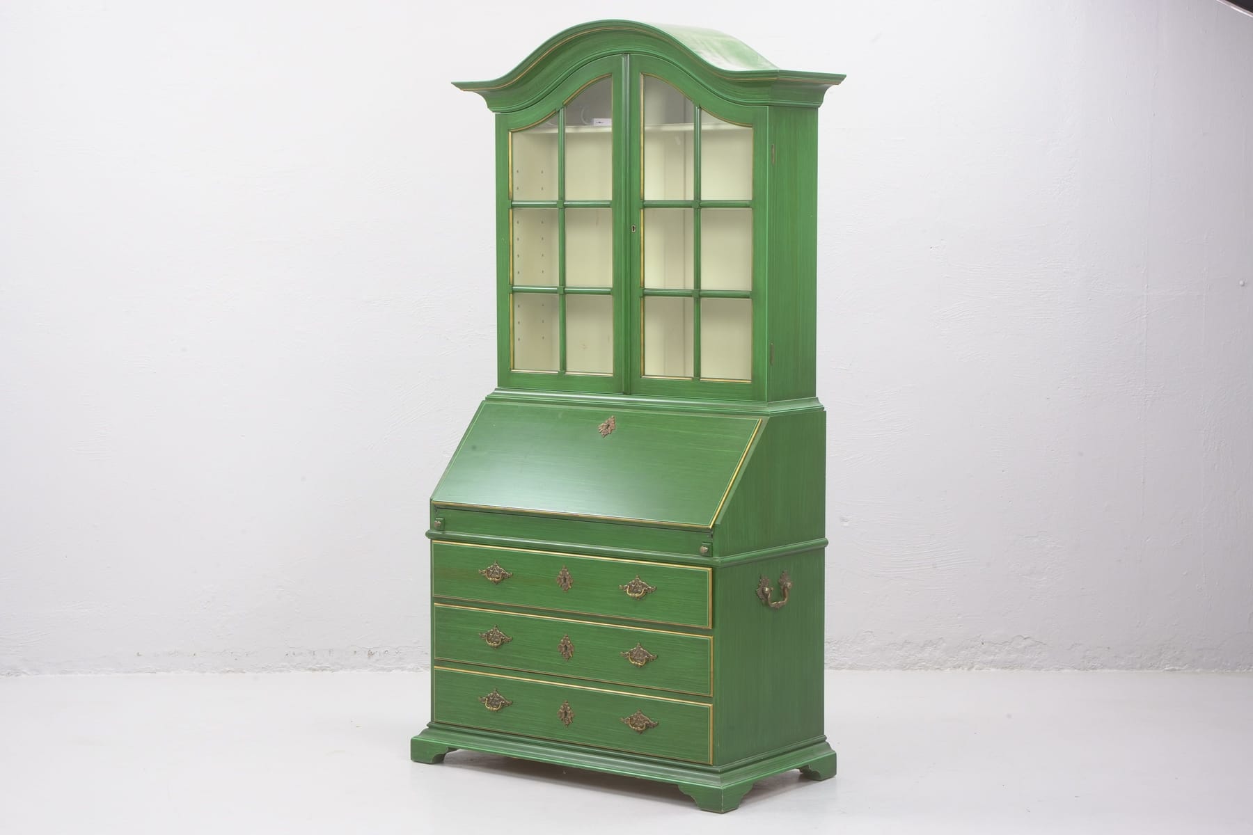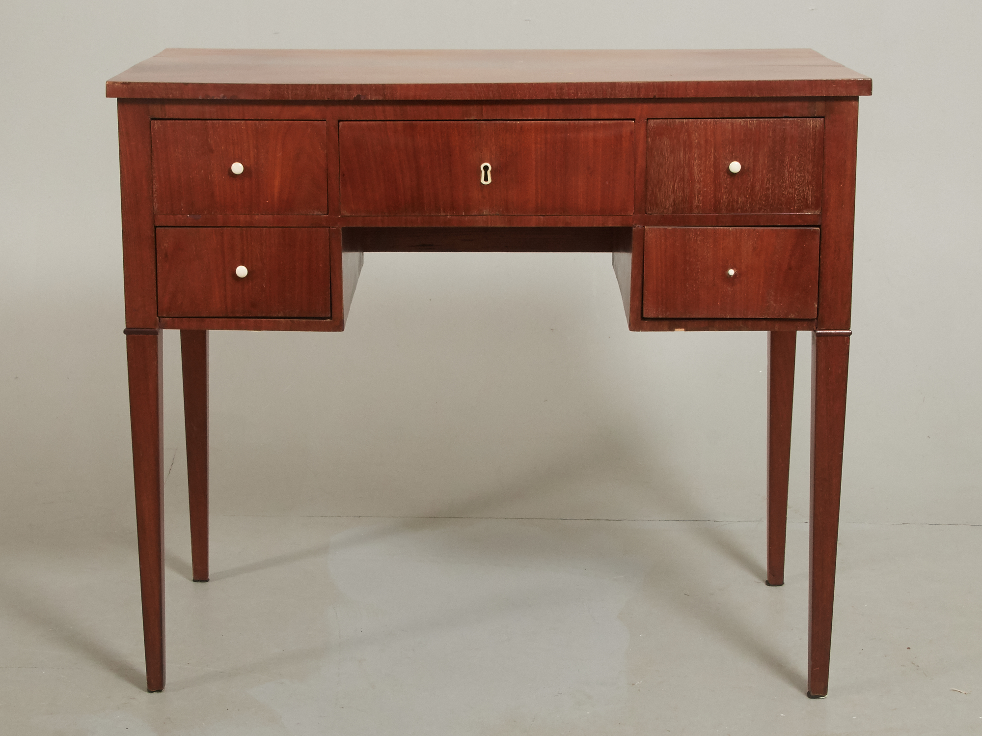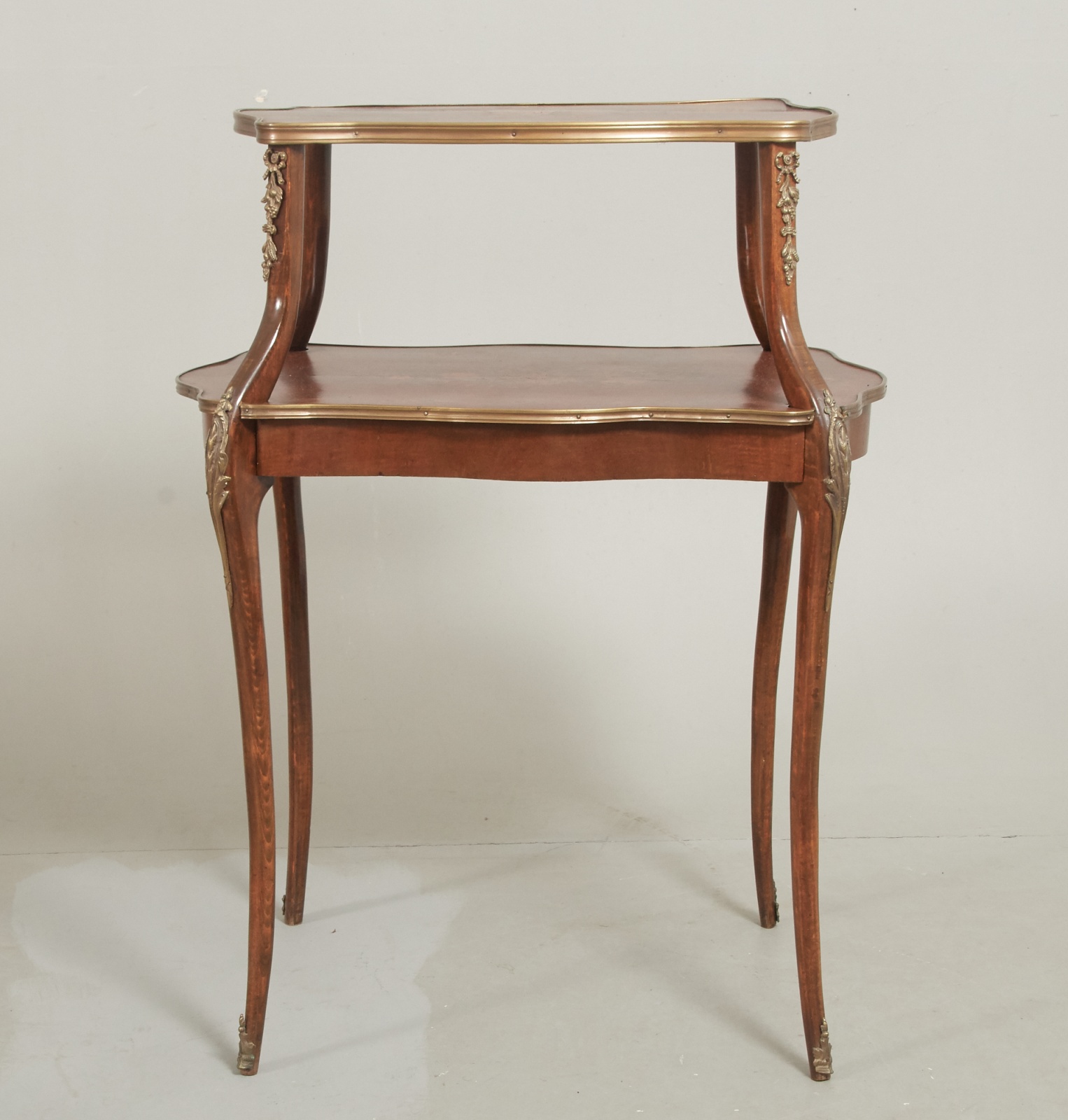 Rokokostil, intarsia i olika träslag, mässingsskodda hyllplan. Höjd 88 cm, 56x34 cm övre hyllplan, undre 67x47 cm. Bruksslitage.