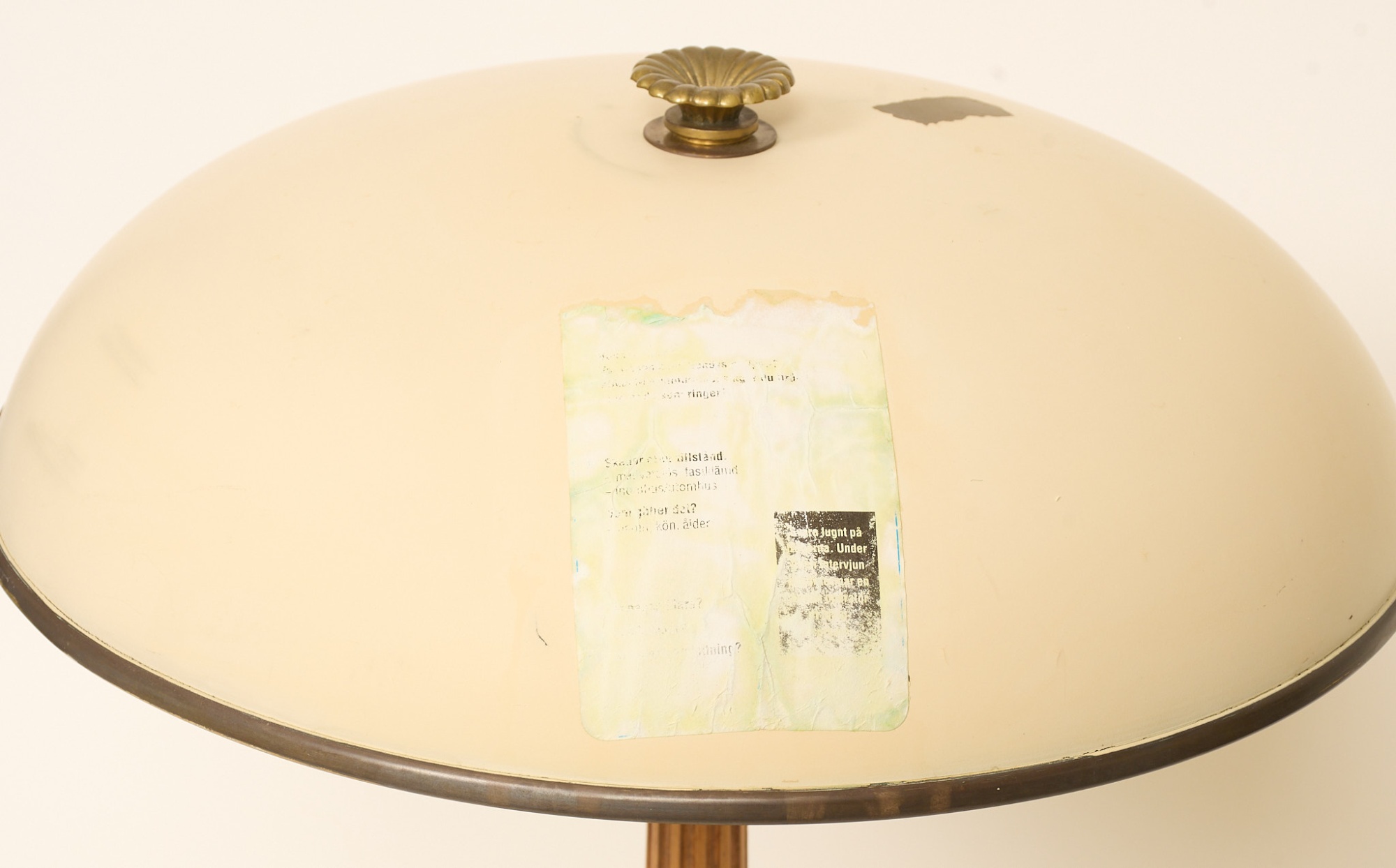 Modell 30246, 1940-tal, design Erik Tidstrand eller Bertil Brisborg, Fot i mässing samt mahogny, skärm i lackerad metall, höjd 50 cm, bruksslitage, skärm med färgsläpp och klistermärke.