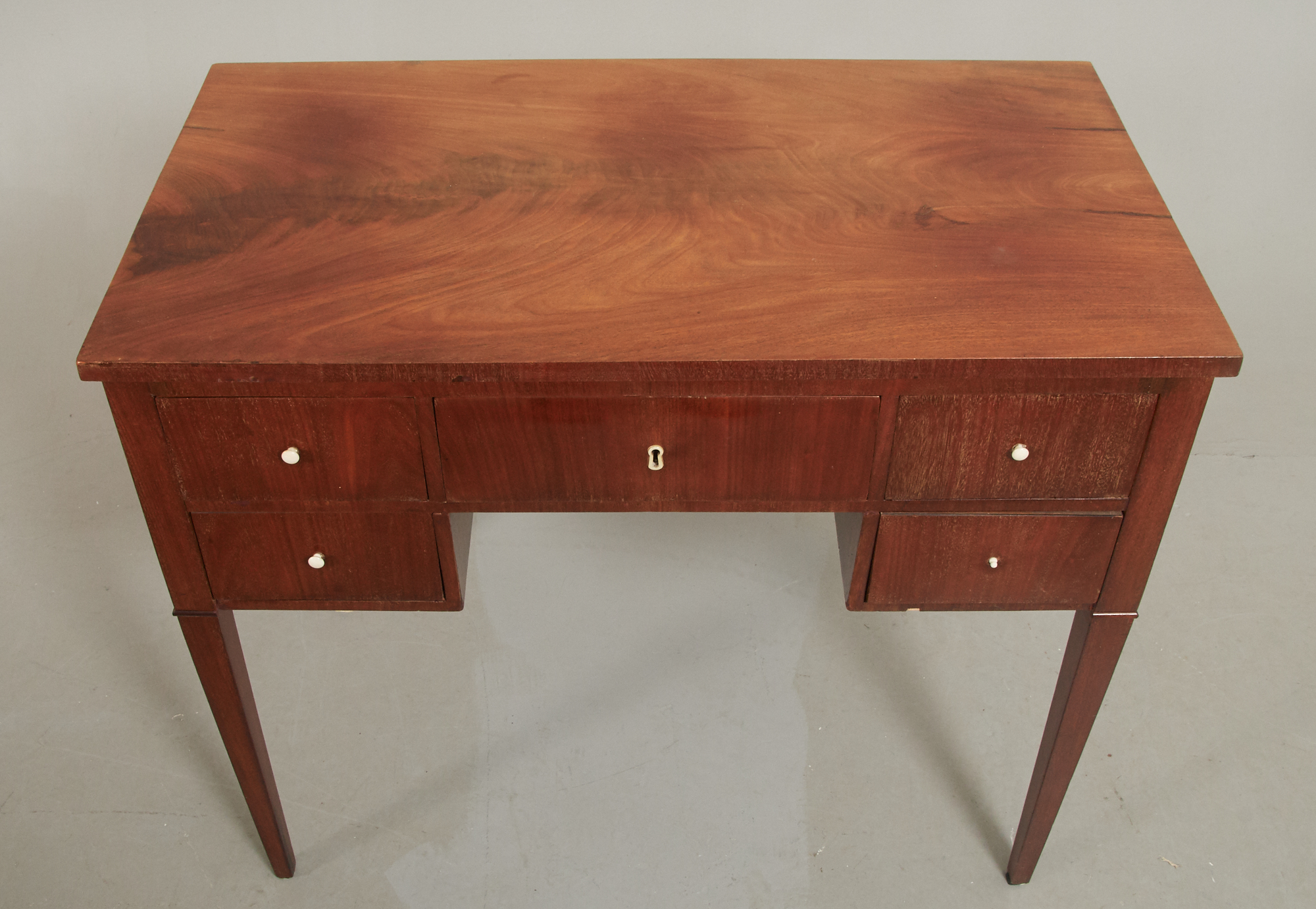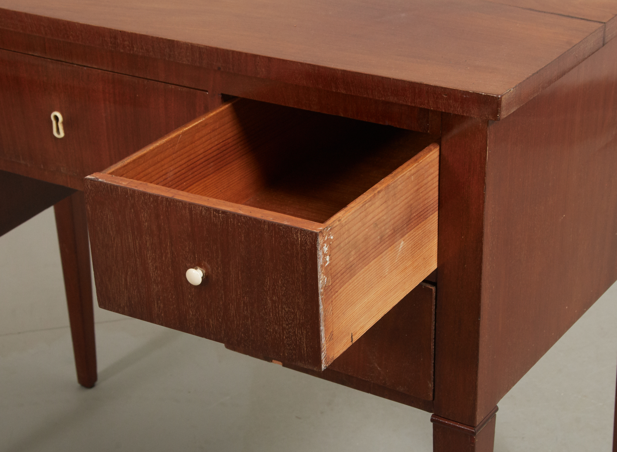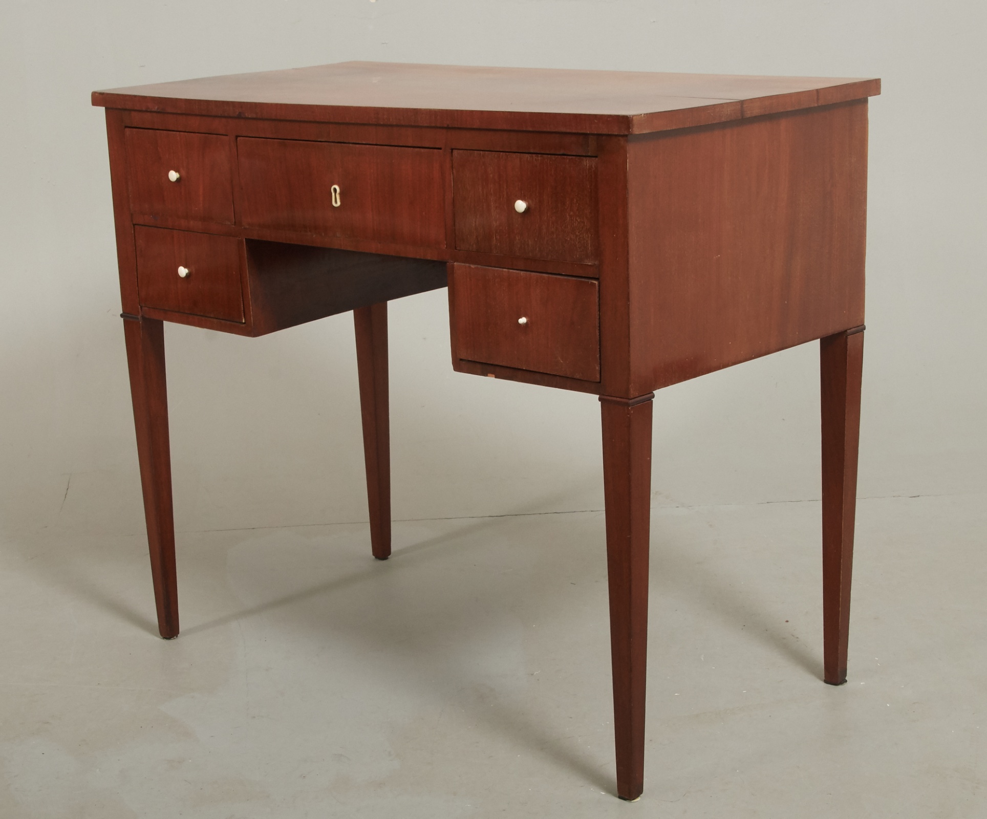 Mahogny, 5 utdragslådor, 89 x 49 cm, höjd 76 cm, en knopp defekt. Nyckel finns.