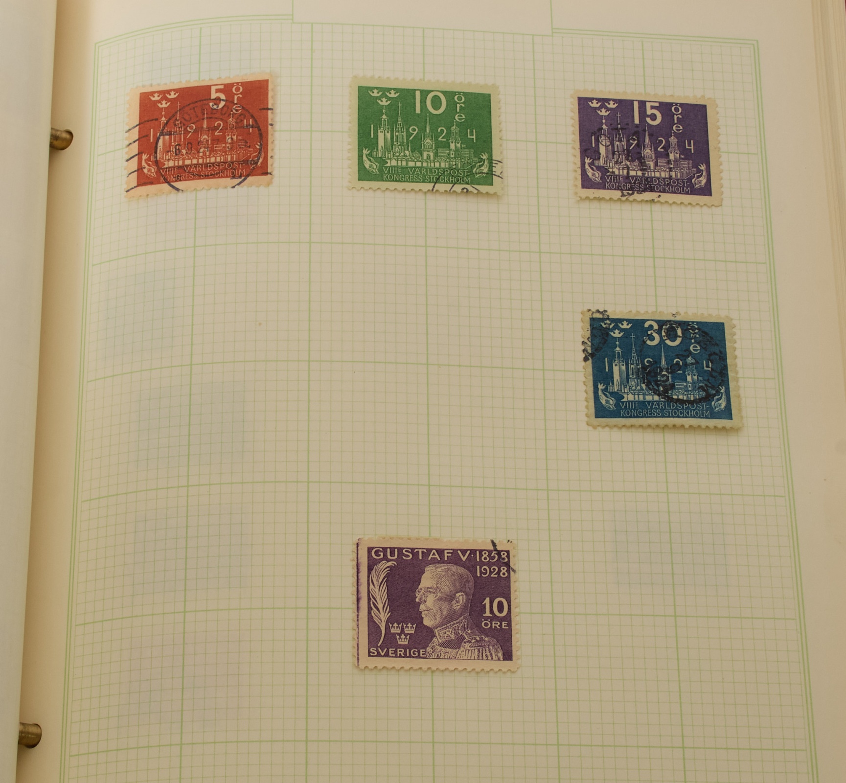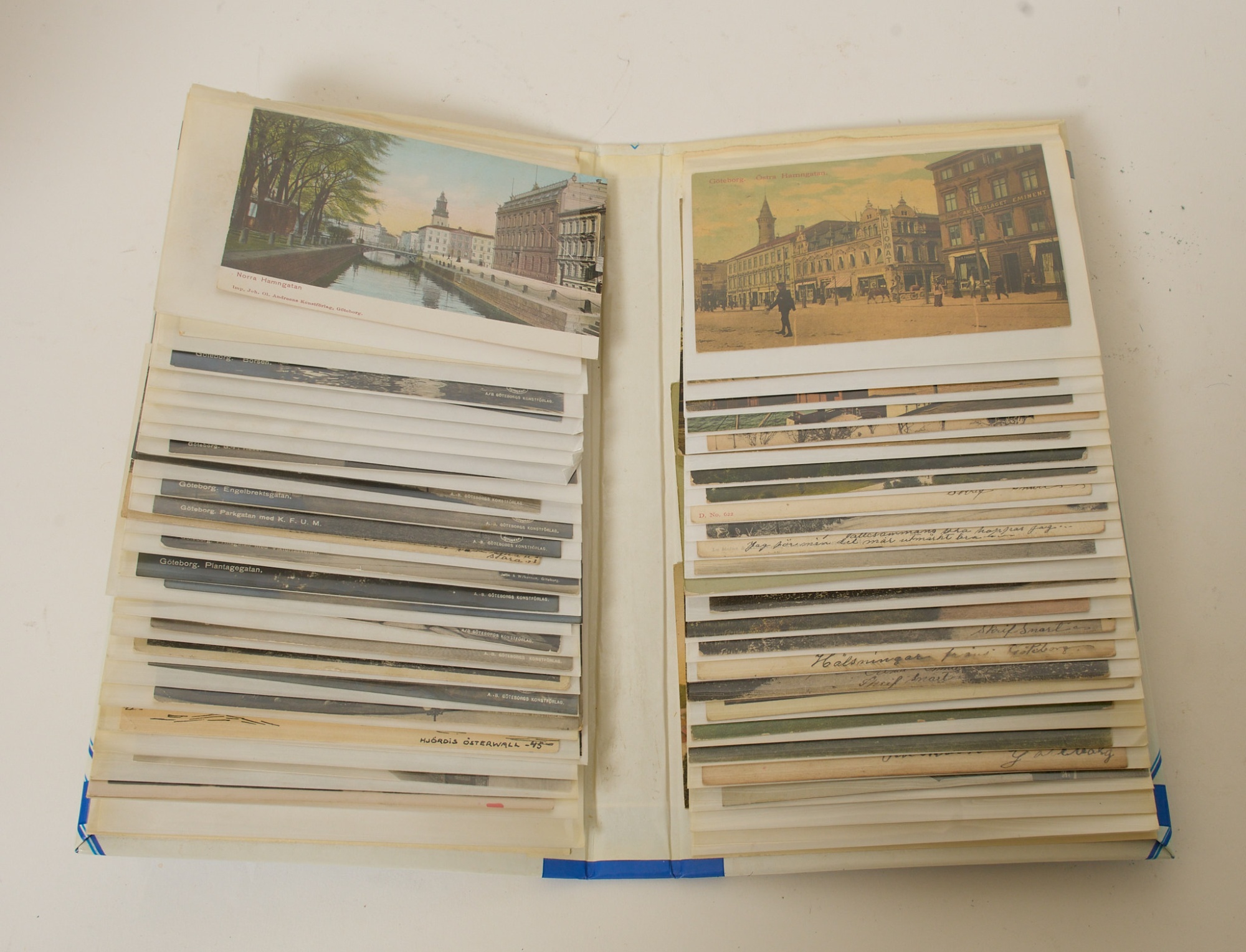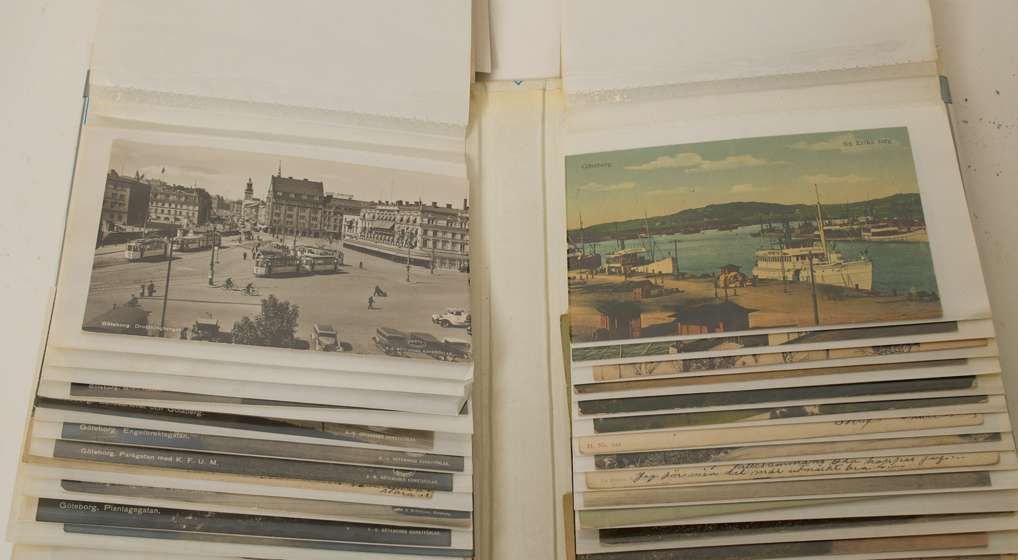 Album hela världen, äldre vykort Göteborg, 48 st, klipp, brev. Postfriskt Sverige, nominal ca 2000 kr, samt 44 st rabattfrimärken.