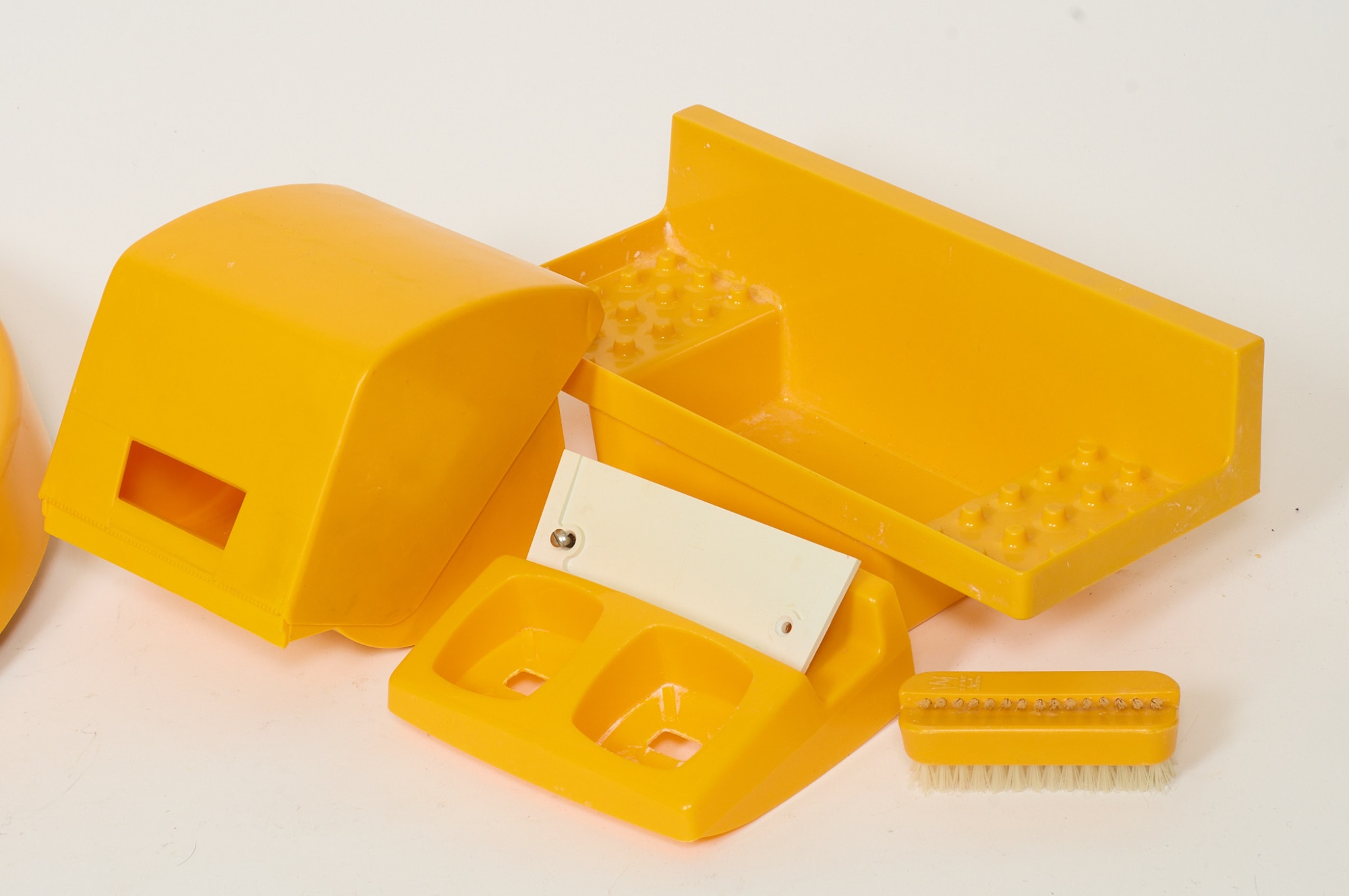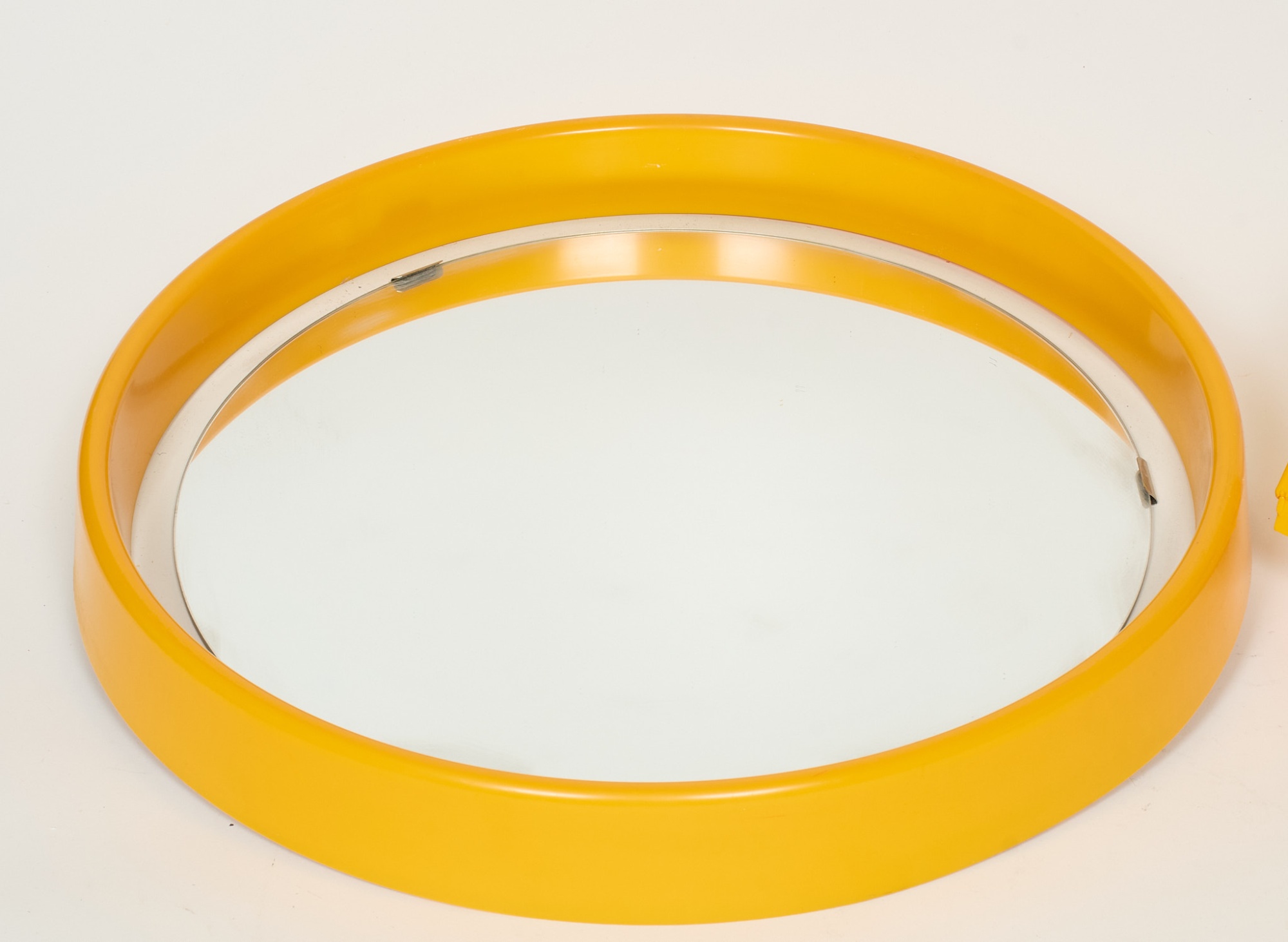 Spegel, diam 39 cm samt toalettrullehållare och 2 hyllor, plast. Bruksslitage.