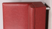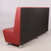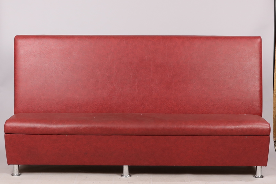 Röd vinylklädsel, fötter i kromad metall, höjd 102, längd 210 cm