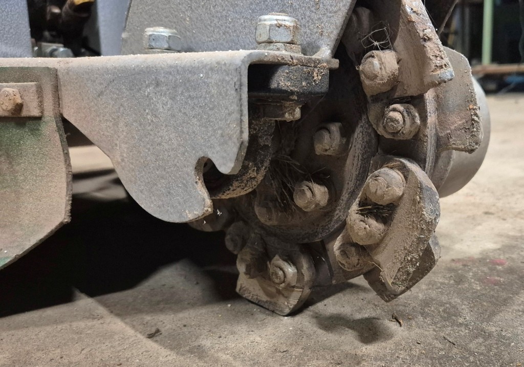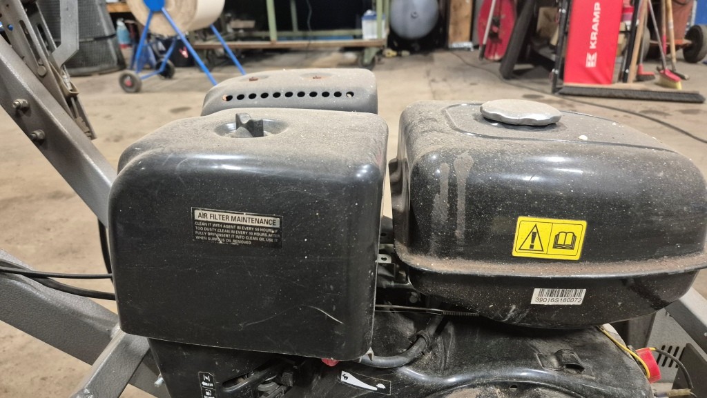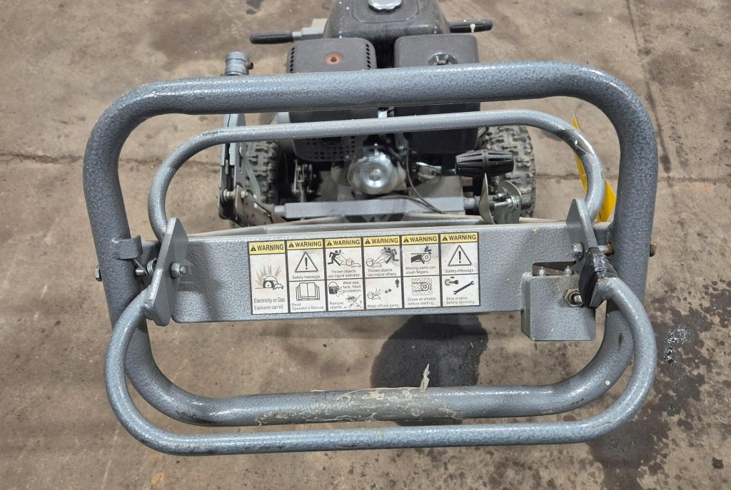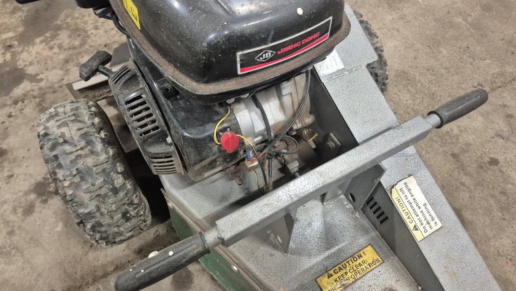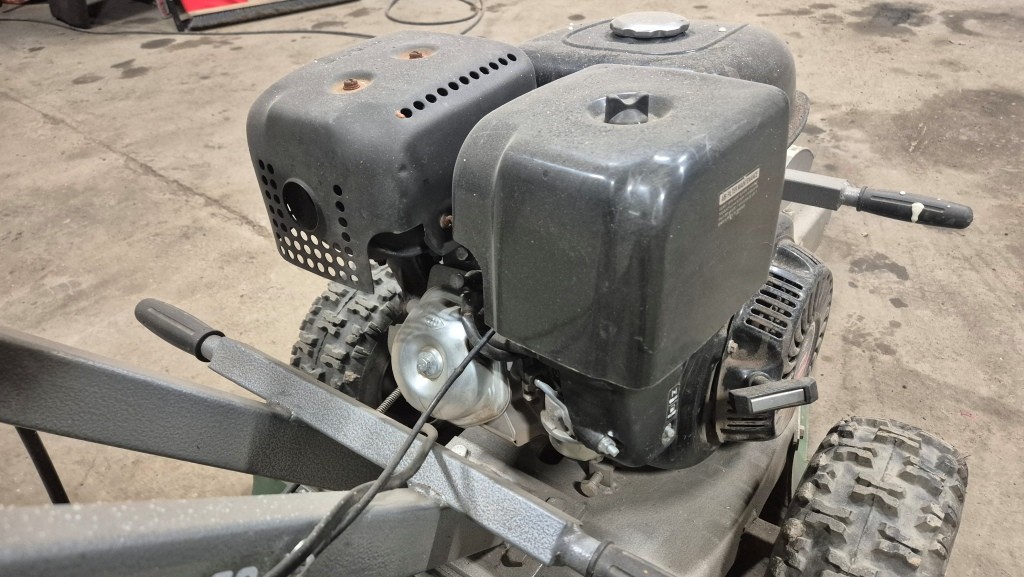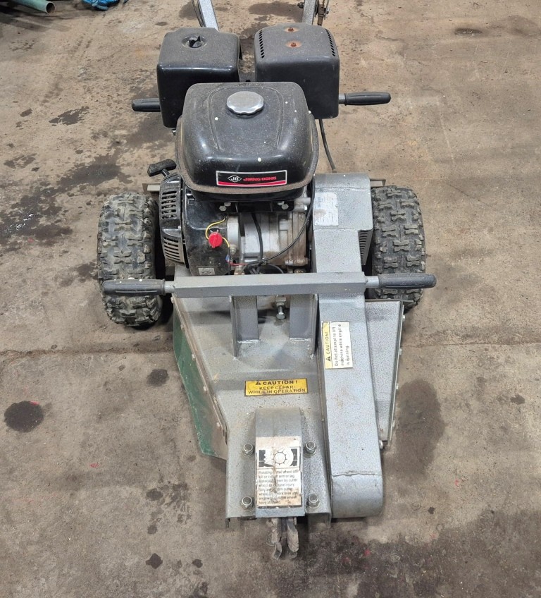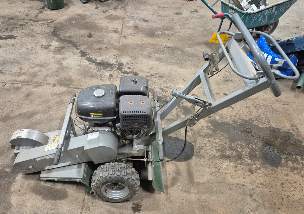 Stubbfräs StumpgrinderFunktionstestad: Startar och går men fräshjulet ligger i och går ej att stänga av. Troligtvis vajern som bör bytas.