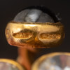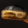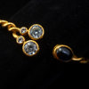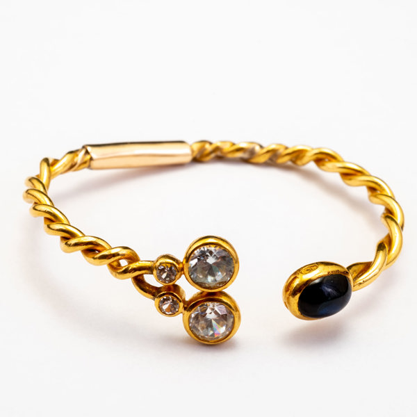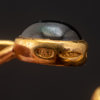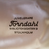 Dekor med bl.a cabochonslipad blå sten, bär stämplar, i etui