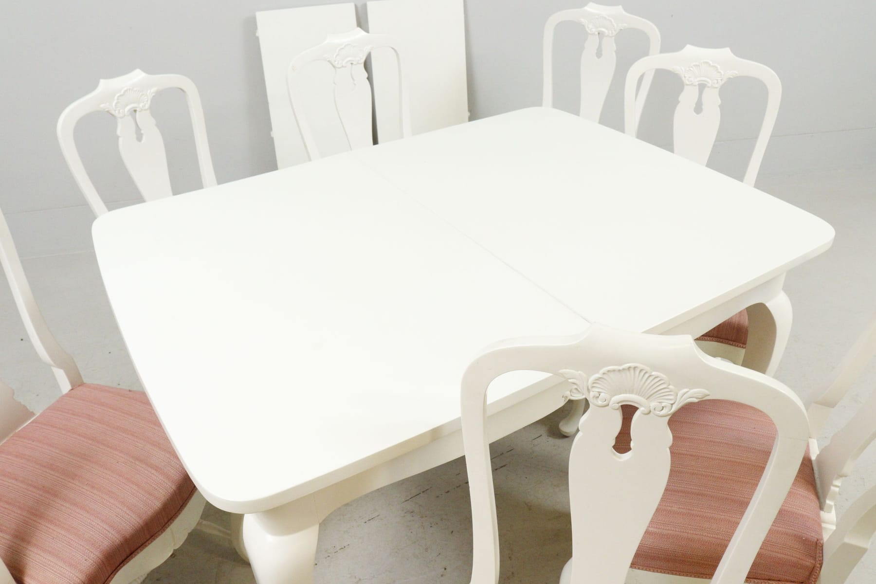 Matgrupp, bord med 8 stolar och 2 iläggsskivor, vitmålat