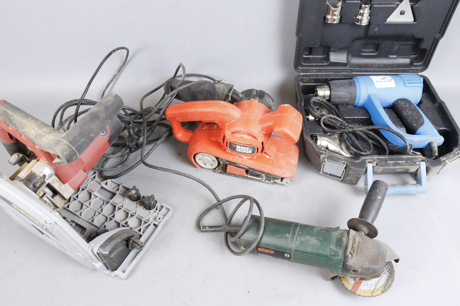 Sänksåg, vinkelslip, slipmaskin och värmepistol