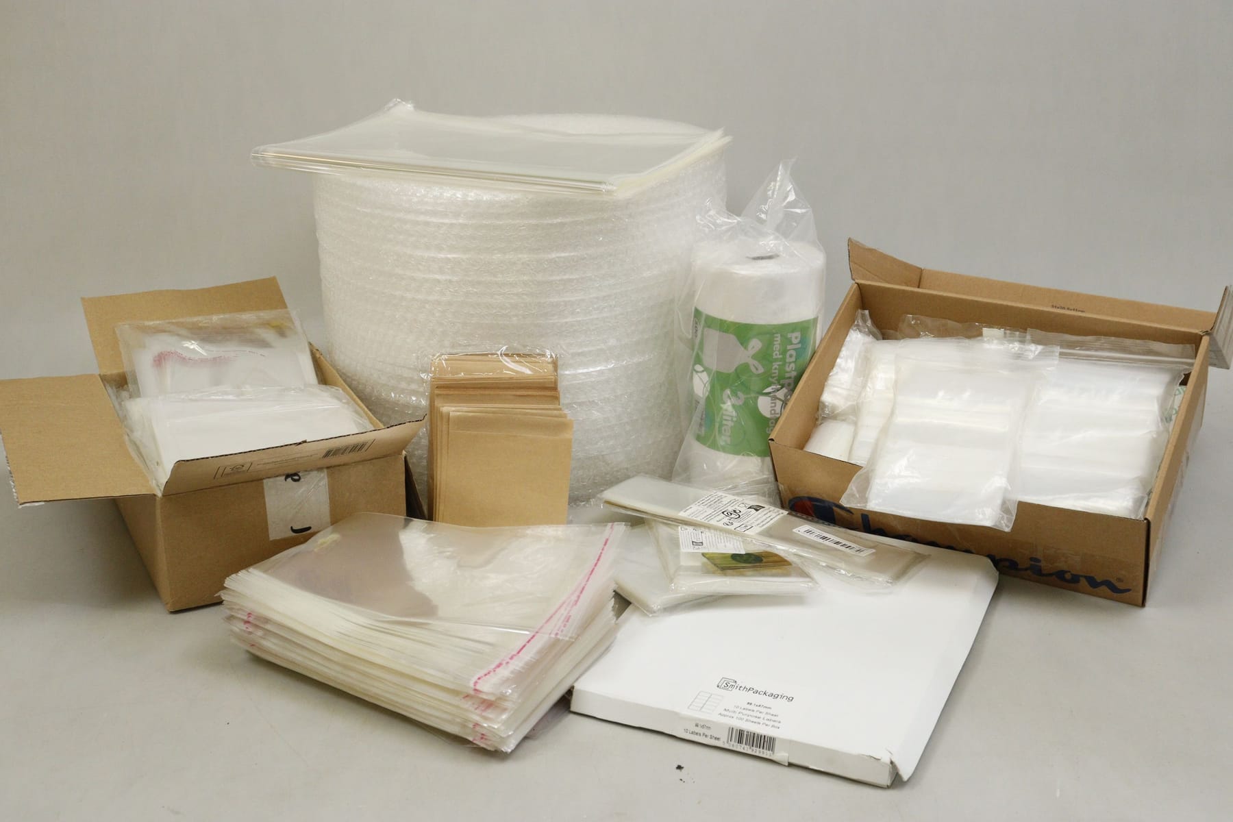 Förpackningsmaterial, bubbelplast, zippåsar, cellofan, etiketter, soppåsar