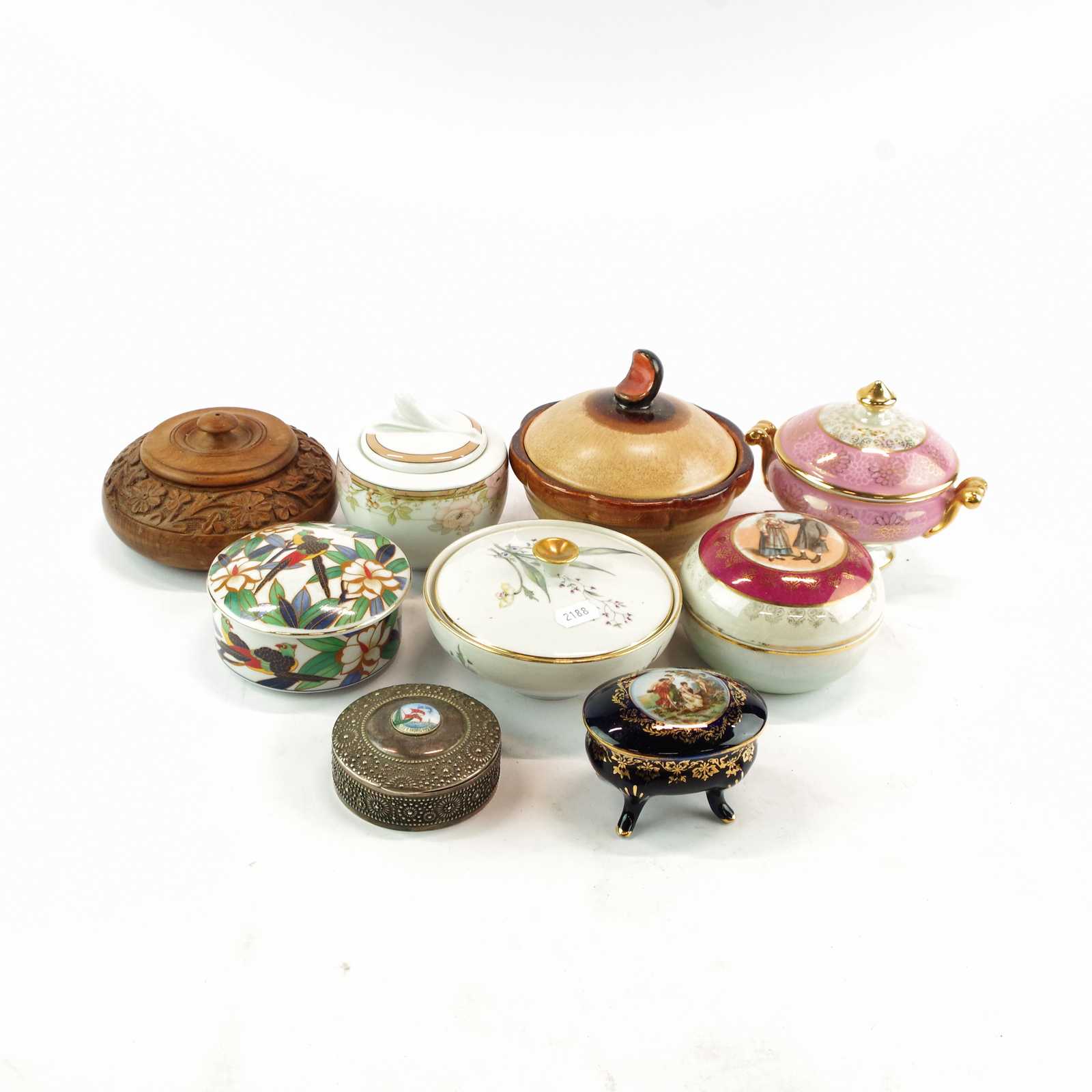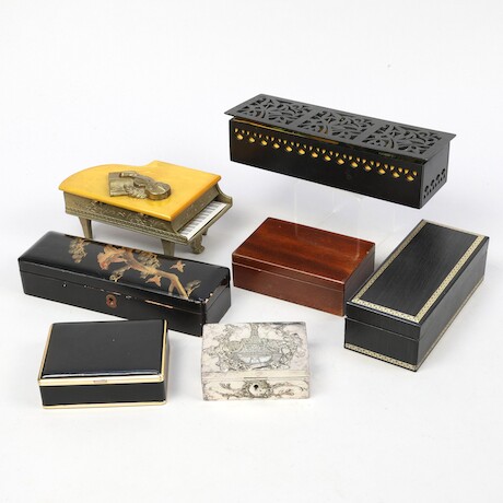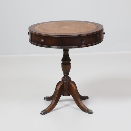 Fanerad, tre lådor, fotavslutningar av mässing, höjd 65, 95 x 46 cm