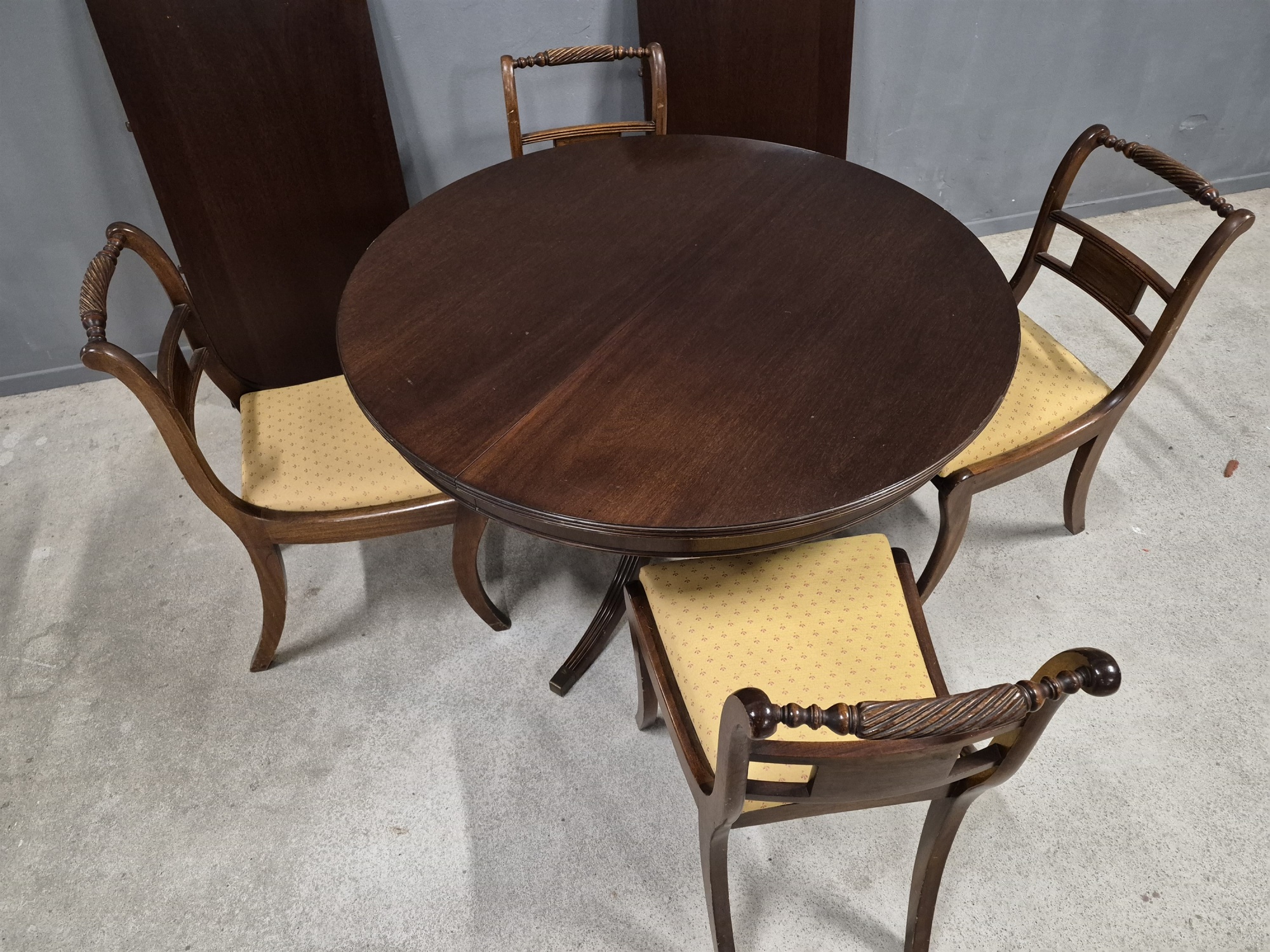 Matgrupp 5 delmahogny empire stil, höjd stolar 82 cm, bord 74 cm, diameter 110 cm