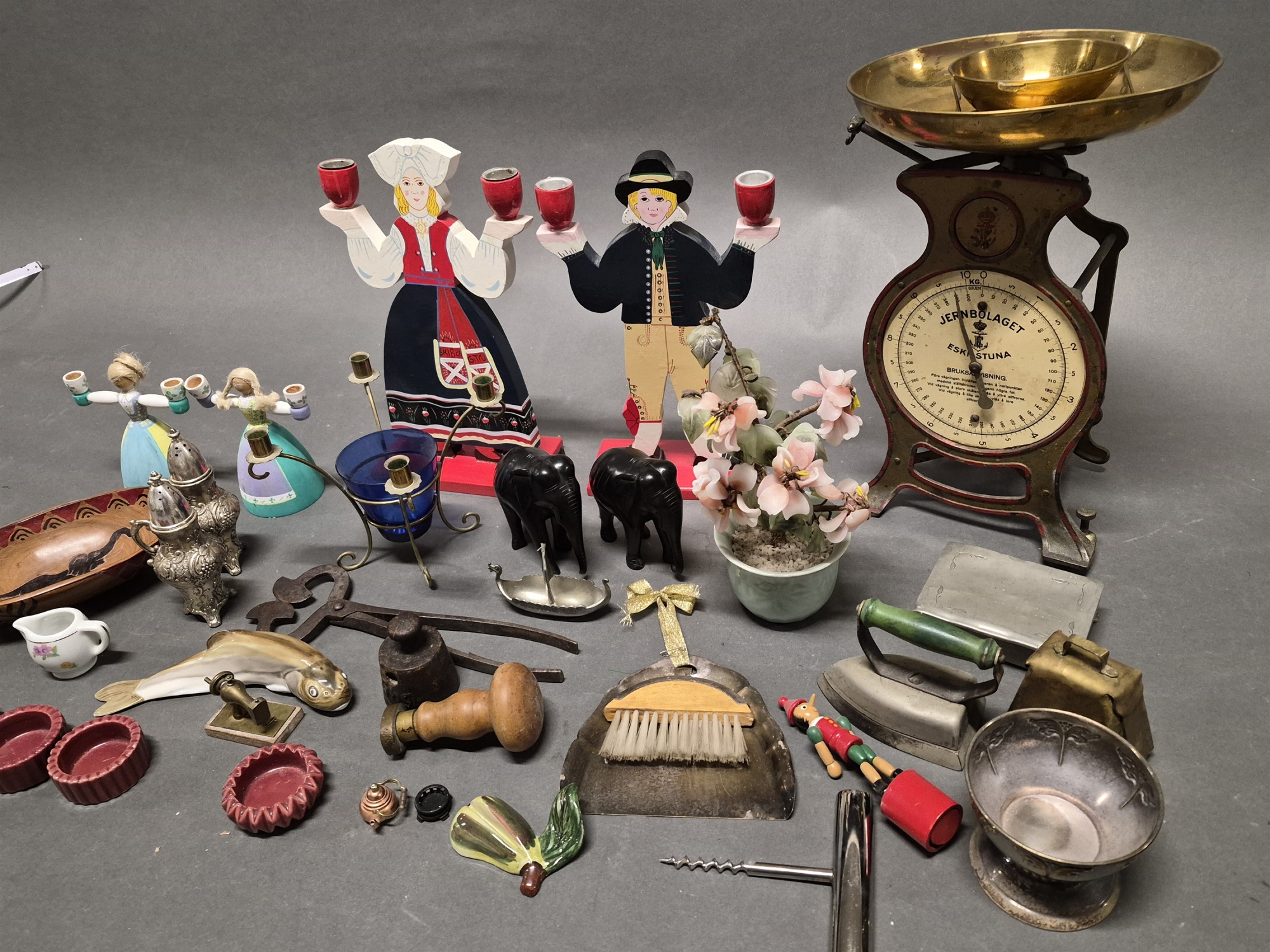 Parti bl.a köksvåg, träljusstakar högsta 42 cm
