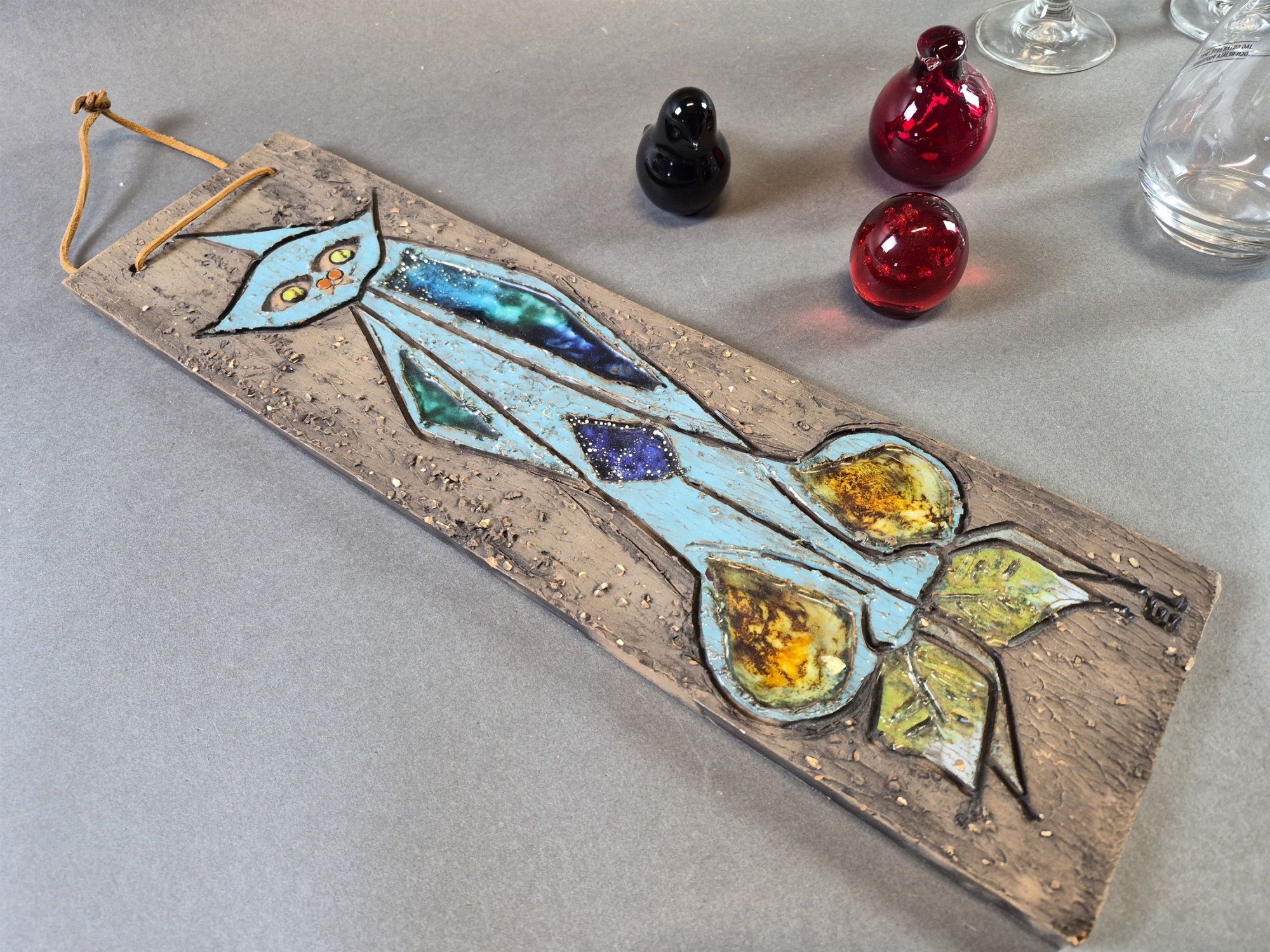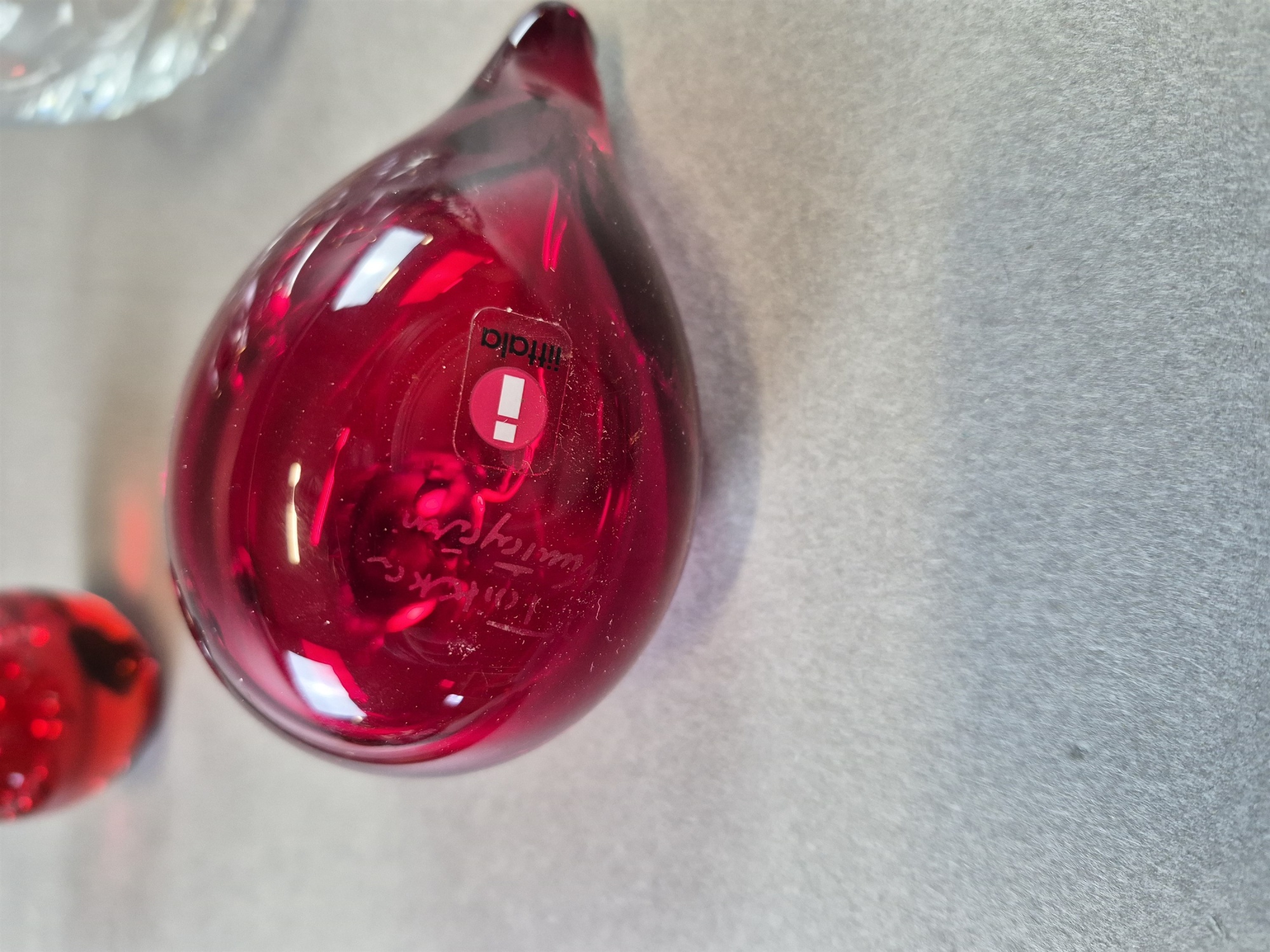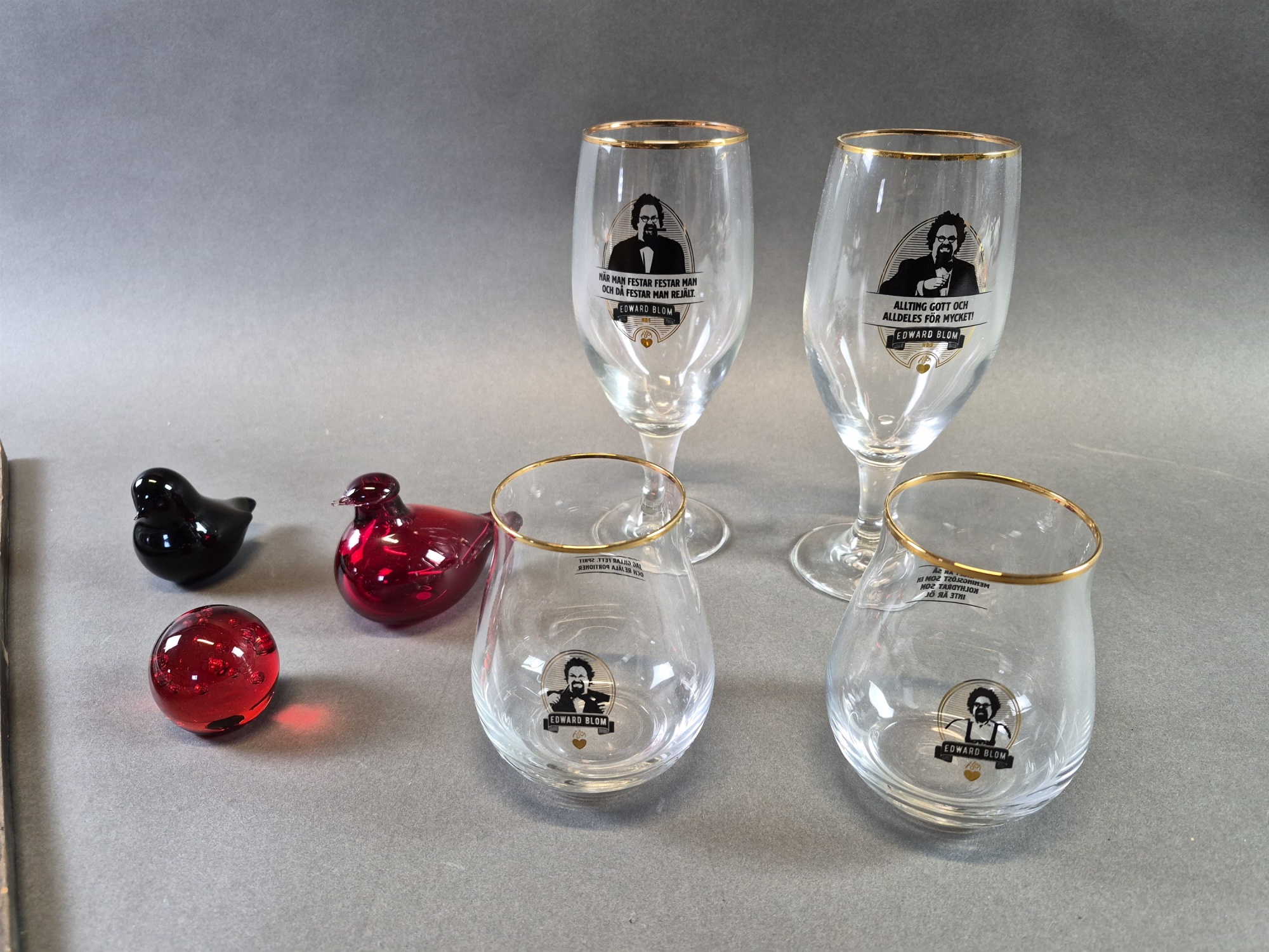 Bilder Parti glasföremål och väggtavla i keramik Tilgmans, bl.a Ittala fågel, öl och whiskyglas av Edward Blom, höjd på ölglas 21 cm