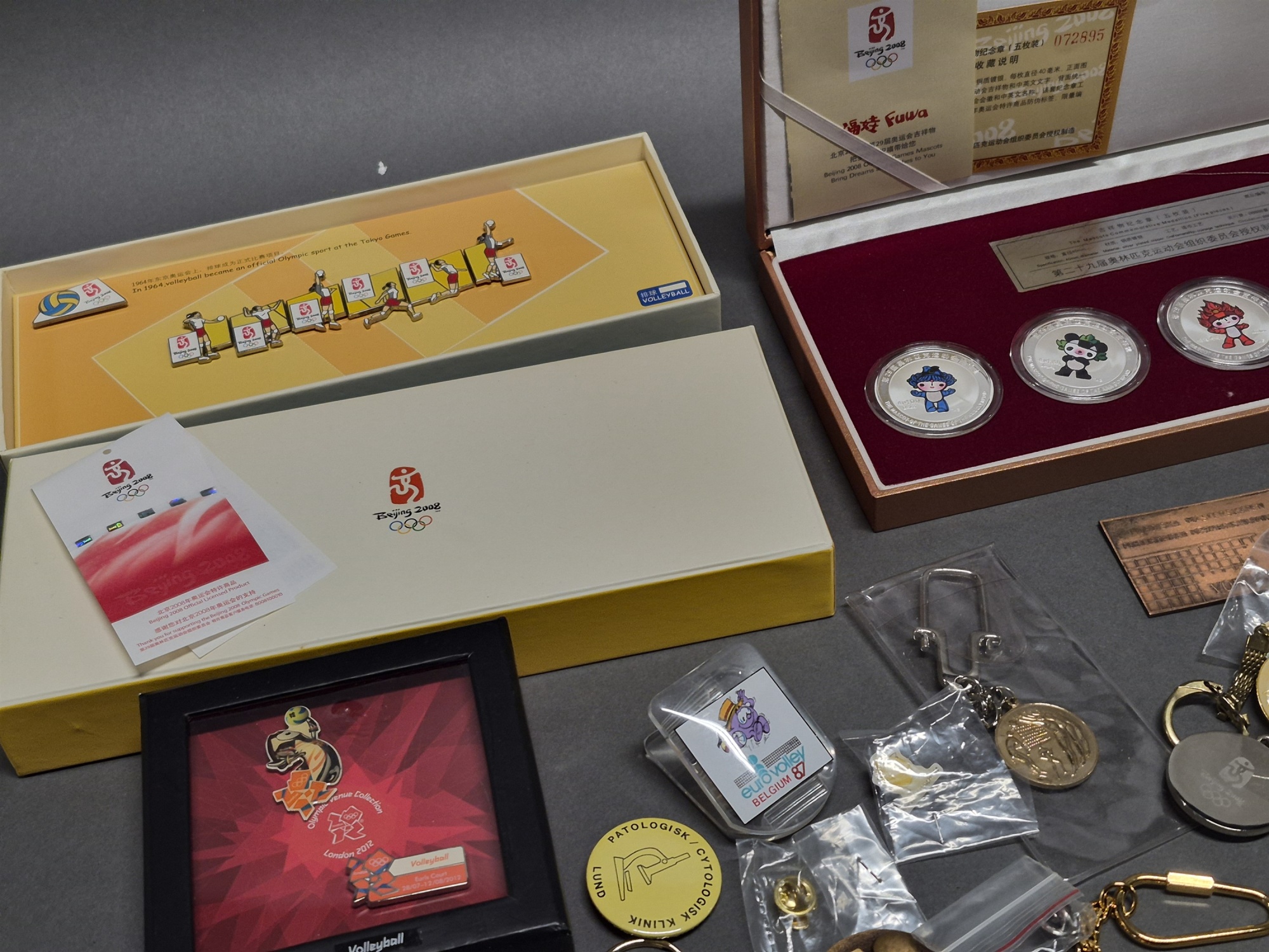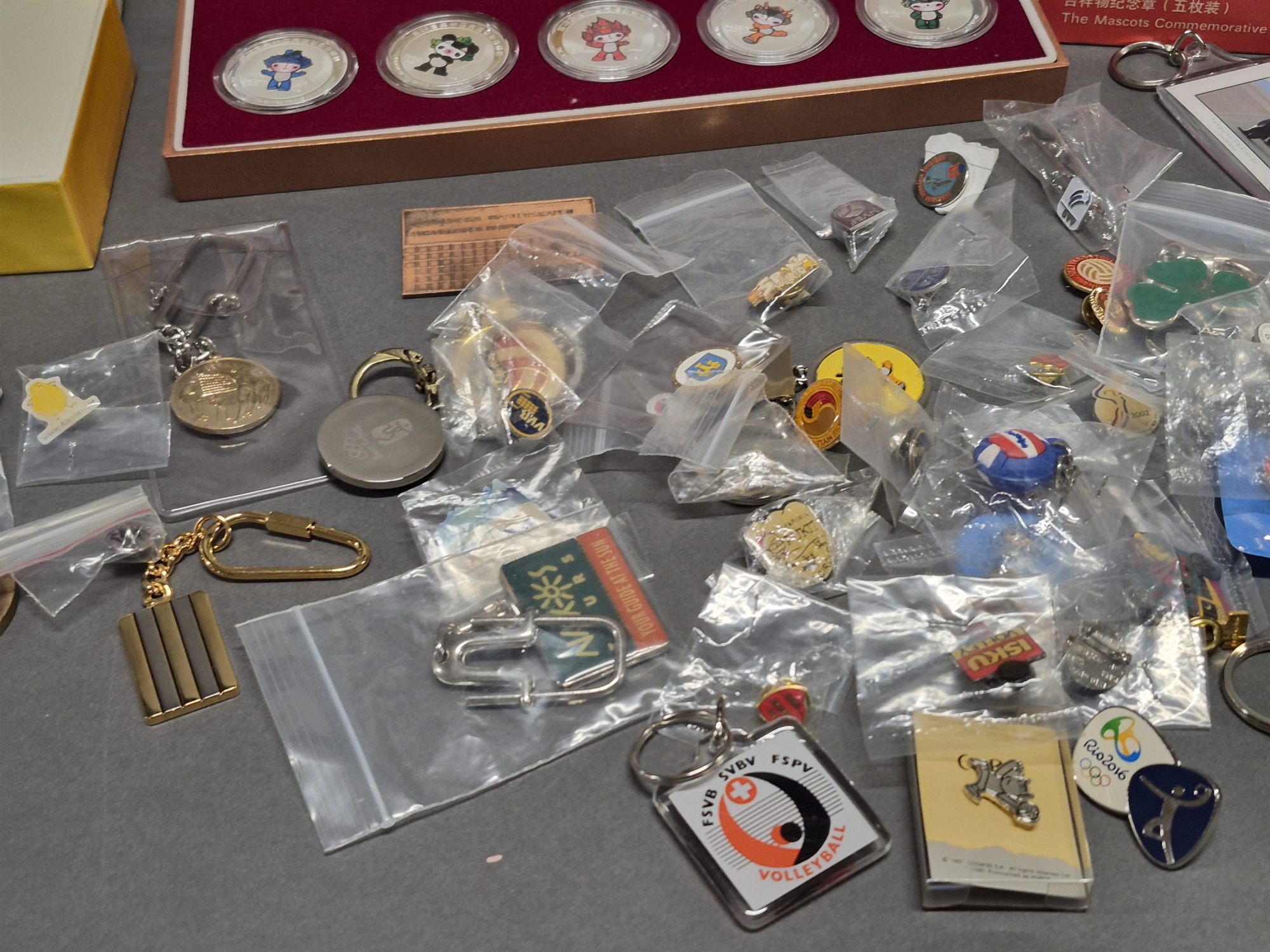 Bilder Parti samlarmynt OS Beijing 2008, pins och nyckelringar bl.a ifrån RIo och USA Volleyboll Team