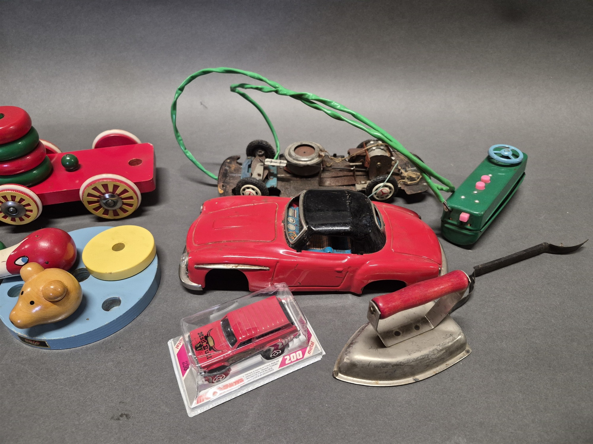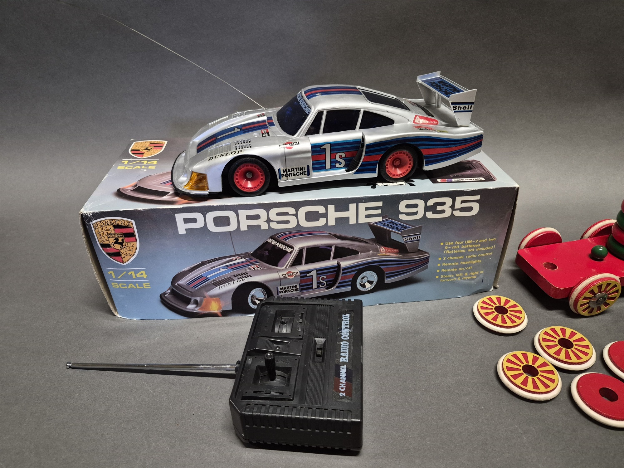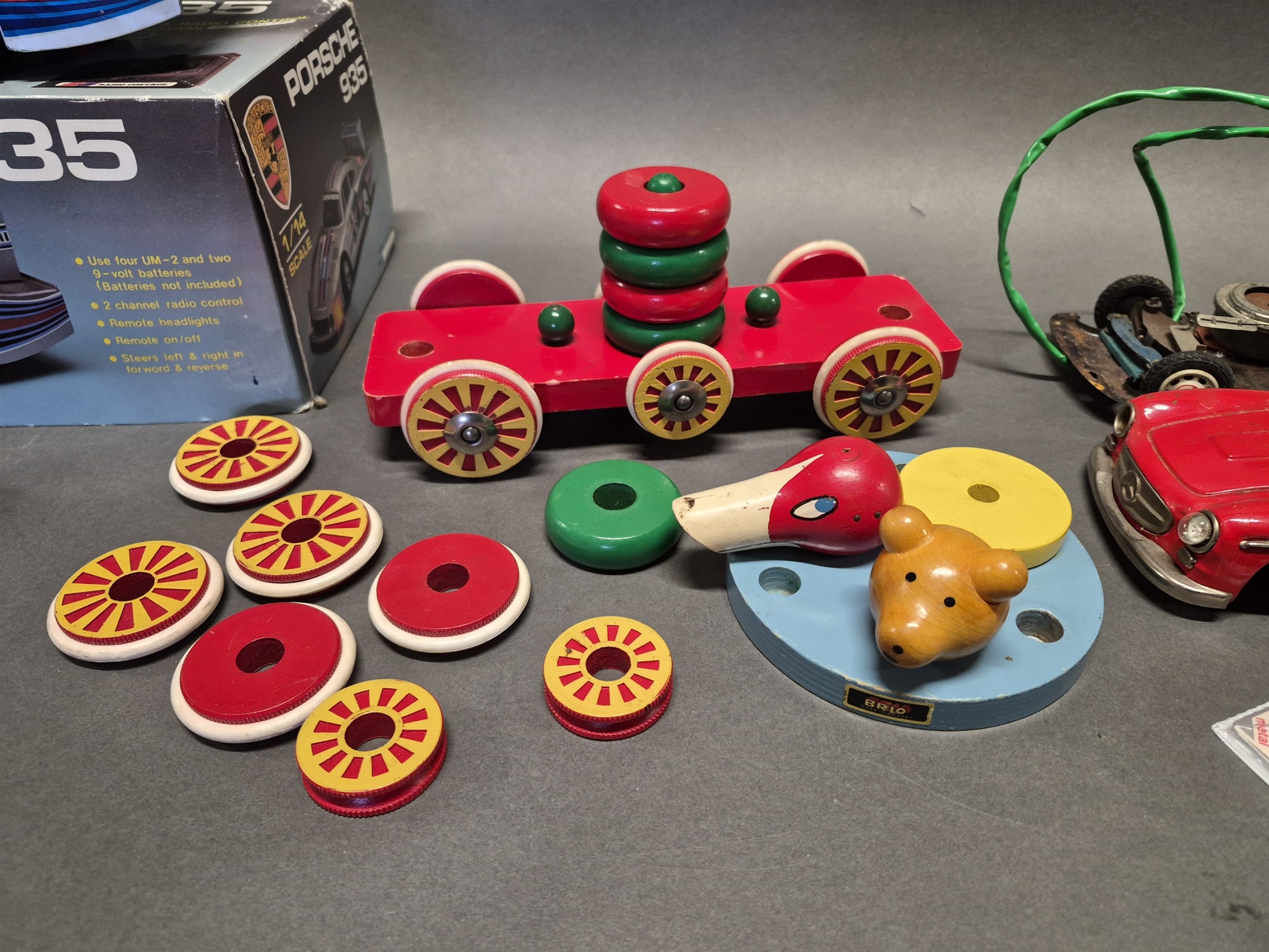 Parti bl.a Radiostyrd bil Porsche, BRIO delar och plåtbil Mercedes, längsta mått 40 cm