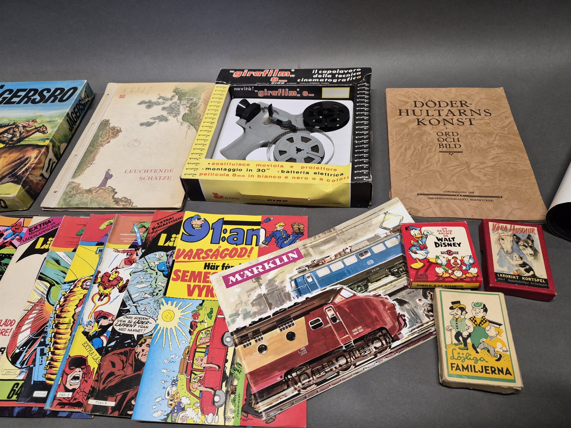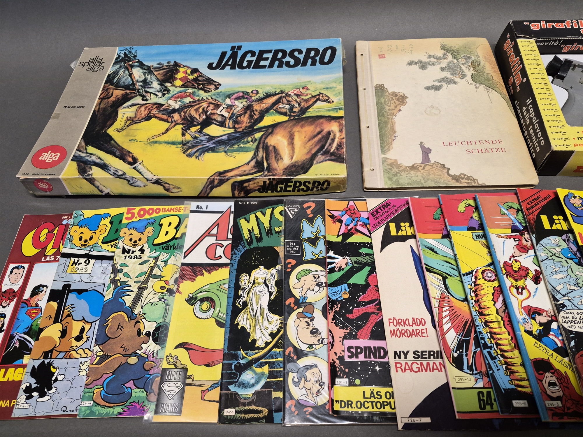 Parti bl.a Serietidningar, Volvo Affisch och Sällskapsspel Jägersro