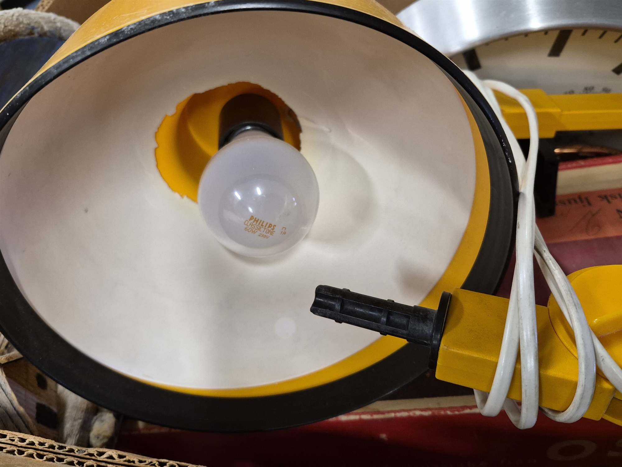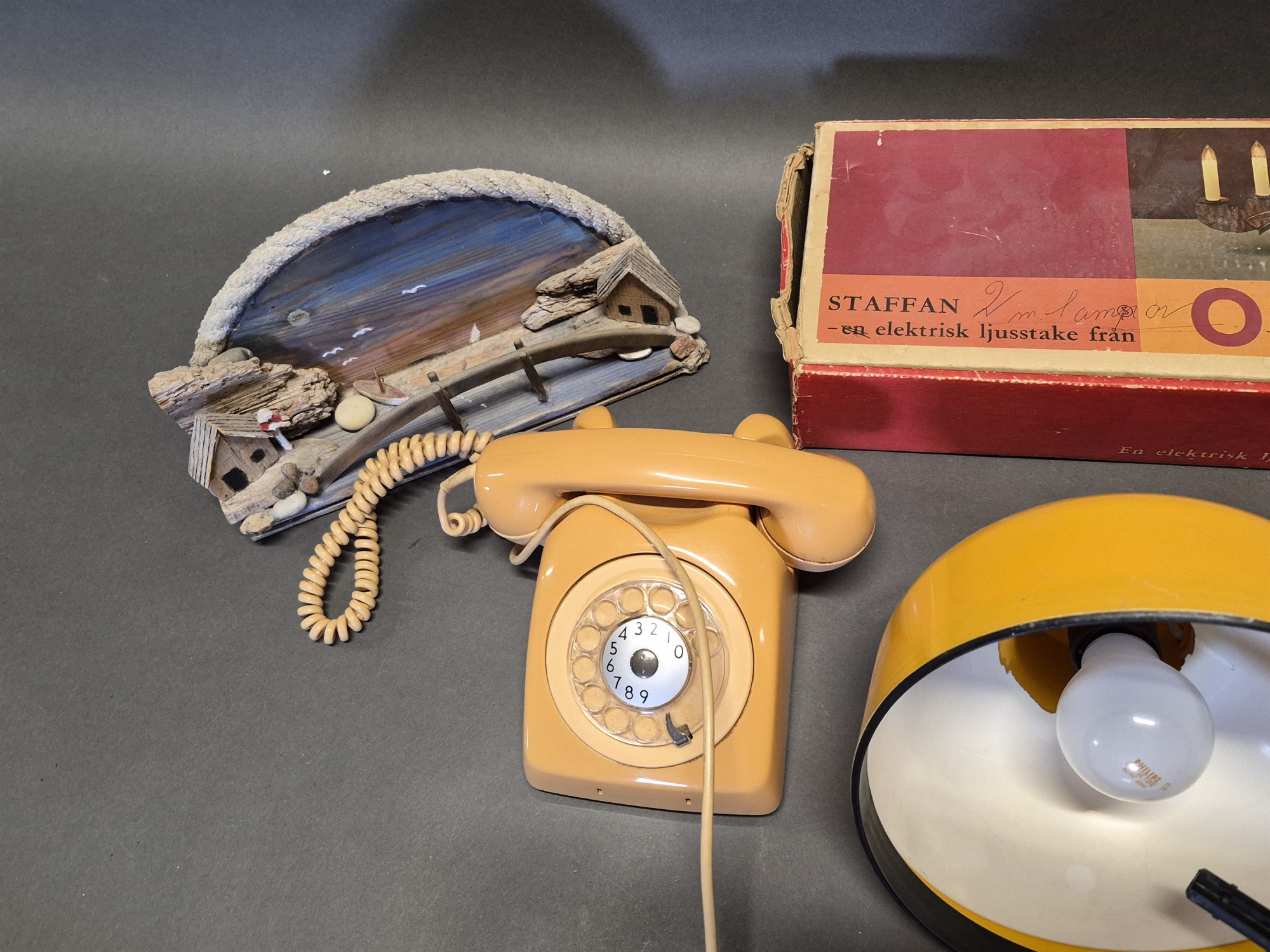 Parti bl.a skrivbordslampa, väggklocka telefon, längsta 50 cm