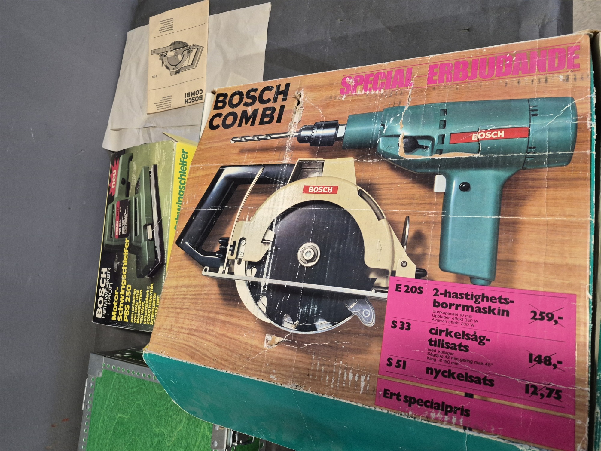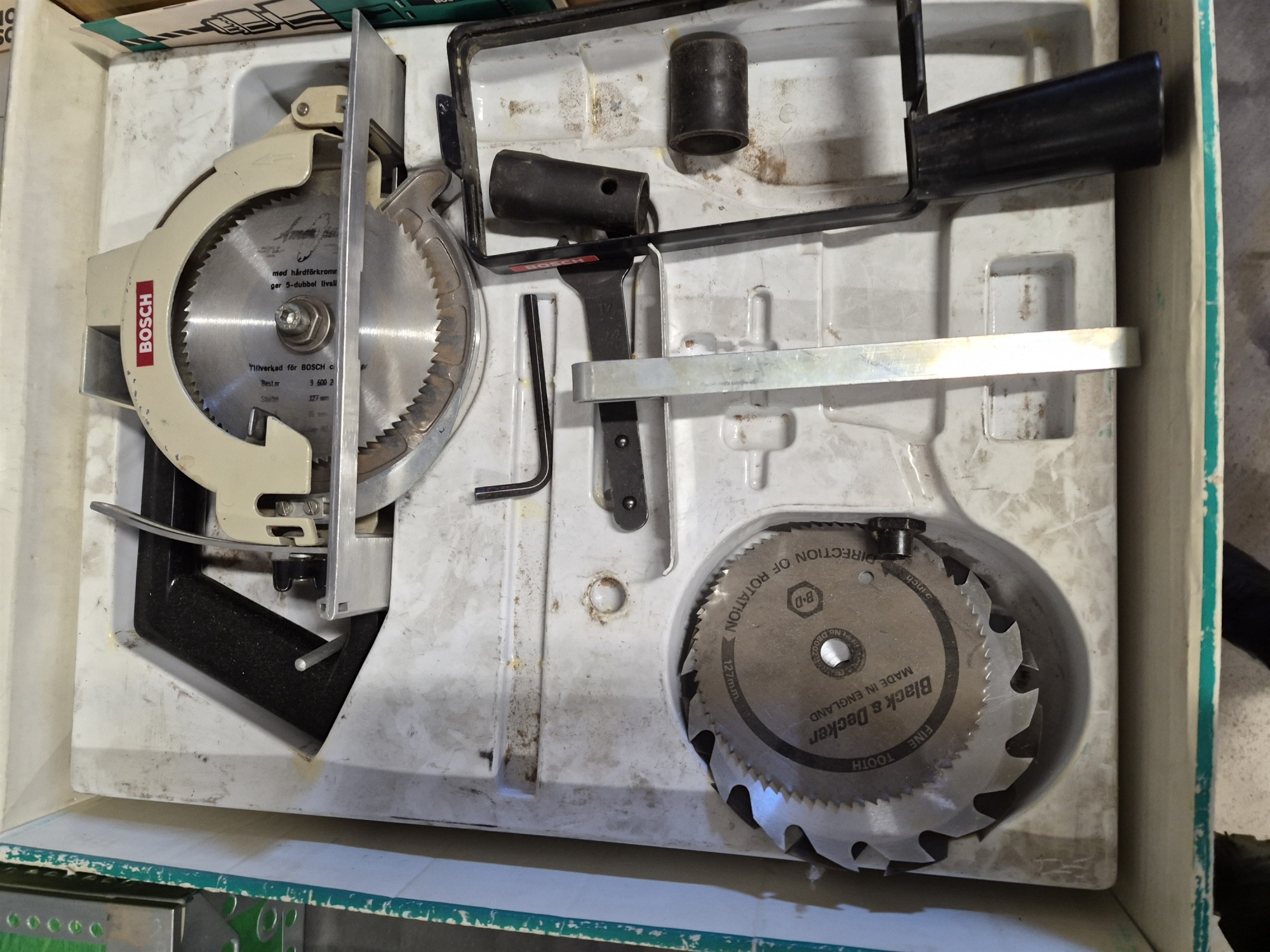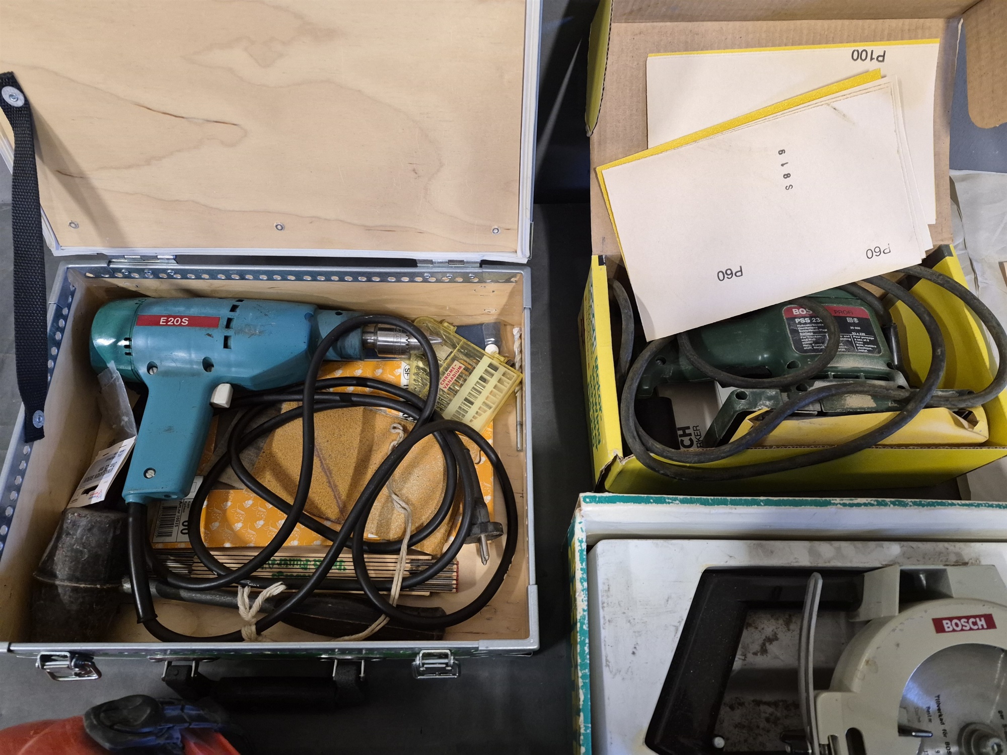 Bilder Parti verktyg bl.a borrmaskin & slipmaskin, skyddshjälm med visir & hörselkåpor längsta låda 51 cm