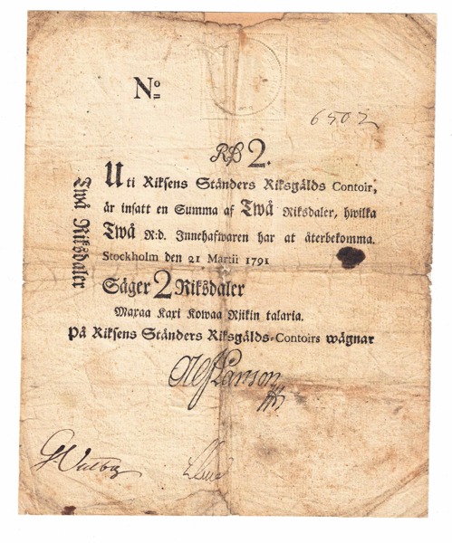 SEDEL. RIKSGÄLDSKONTORET. 2 riksdaler 1791. Nr 6502. SS 62. Lagningar. Repaired.