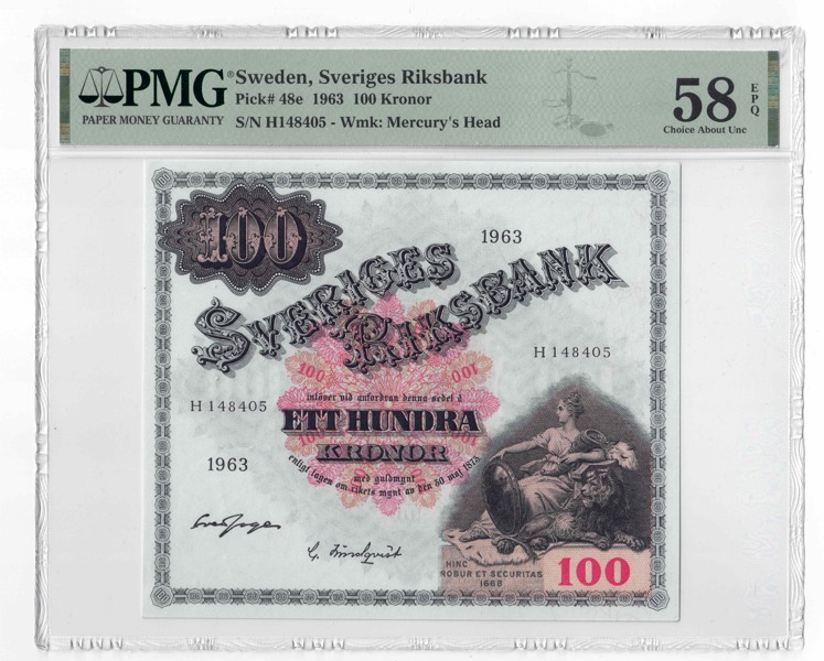 SEDEL. 100 kronor 1963. H 148405. SF 8. I PMG-förpackning graderad 58.