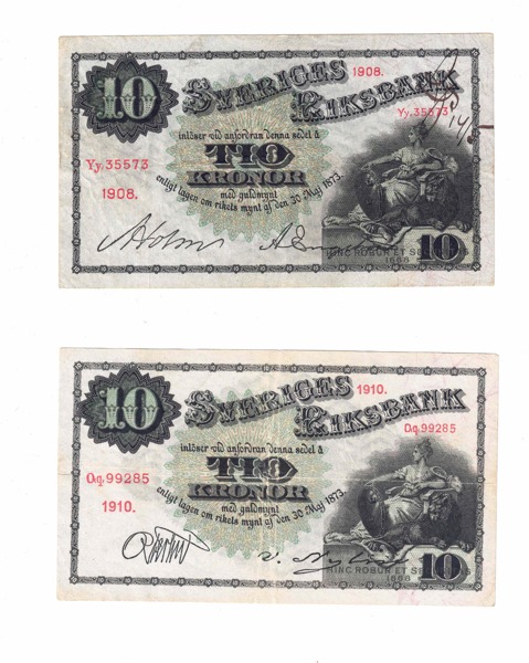 SEDLAR. 10 kronor 1908, 1910. Totalt 2 ex.