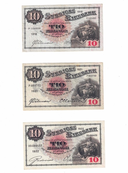 SEDLAR. 10 kronor 1918, 1921, 1922. Totalt 3 ex.