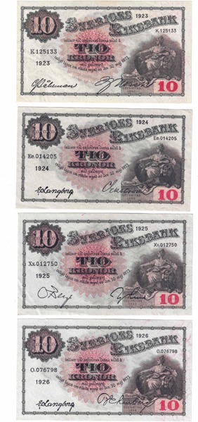 SEDLAR. 10 kronor 1923, 1924, 1925, 1926. Totalt 4 ex.