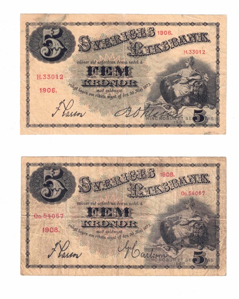 SEDLAR. 5 kronor 1906, 1908. Totalt 2 ex.